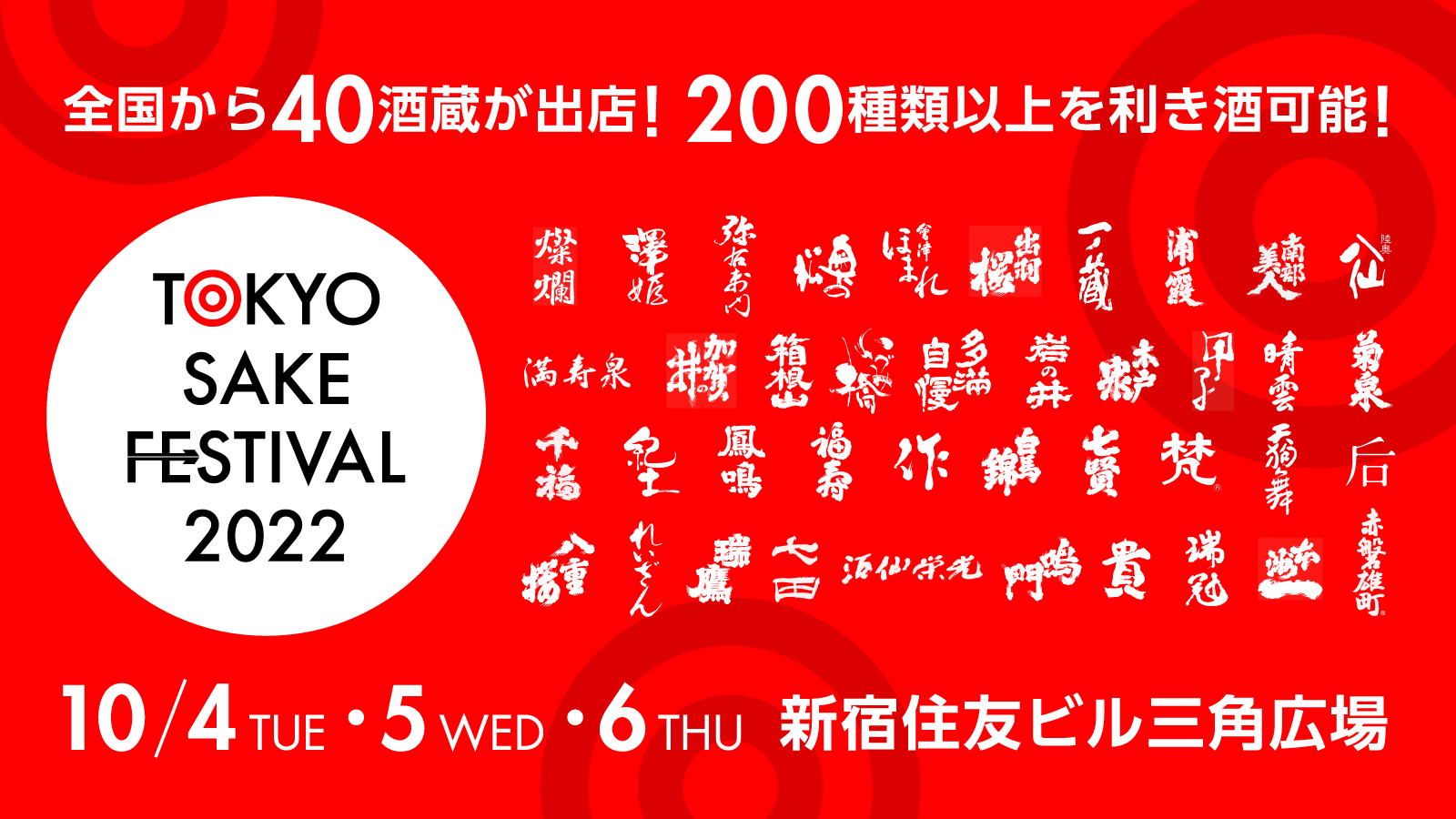 TOKYO SAKE FESTIVAL実行委員会(東京都千代田区 委員長:辻尚之)は、 「“SAKE”を世界に︕」 をテーマに、日本を代表する40の酒蔵が出店、ステージで日本酒アンバサダーと20組以上の豪華アーティスト達が一堂に会する日本最大級の日本酒フェス「TOKYO SAKE FESTIVAL 2022」を2022年10月4日(火)~6日(木)の3日間、全天候アトリウムの新宿住友ビル三角広場にて開催いたします。
