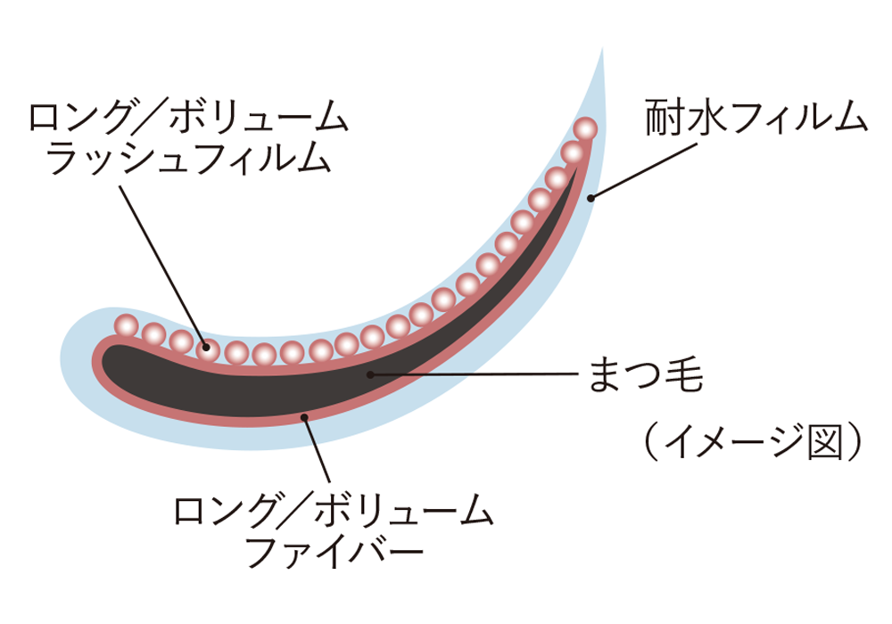 フィルム層と微細繊維(ロング)と密着ワックス(ボリューム)量のバランスにこだわり、効果をよりアップさせました。