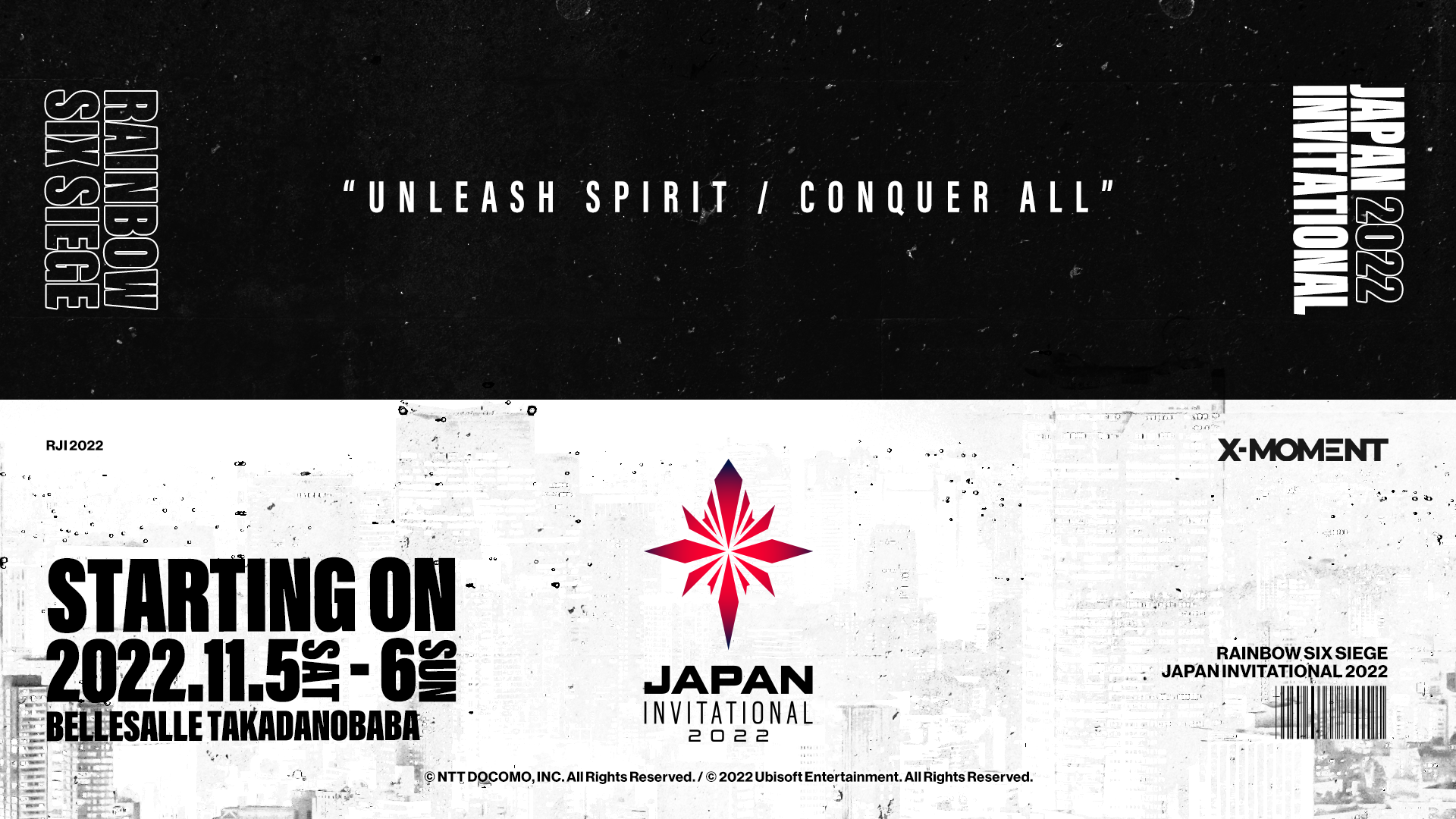 株式会社NTTドコモ(以下、ドコモ)が主催する、『レインボーシックス シージ』国内トップリーグ「X-MOMENT Rainbow Six Japan League 2022(以下、RJL 2022)」は、国内外の強豪チームによる招待大会「Rainbow Six Japan Invitational 2022(以下、RJI 2022)」を開催し、11月5日(土)、6日(日)にベルサール高田馬場にて開催されるFinal大会のチケット先行販売を10月1日(土)に開始することをお知らせいたします。