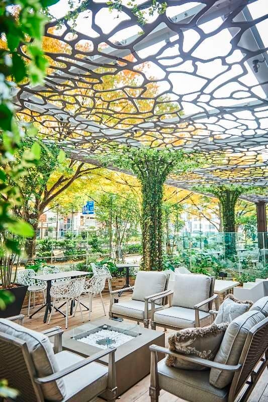 表参道のケヤキ並木から続くロビーに、緑の木洩れ陽が差し込むテラス。