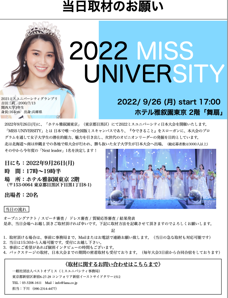引き続き、ミス・ユニバーシティ2022の応援、よろしくお願いいたします!」
