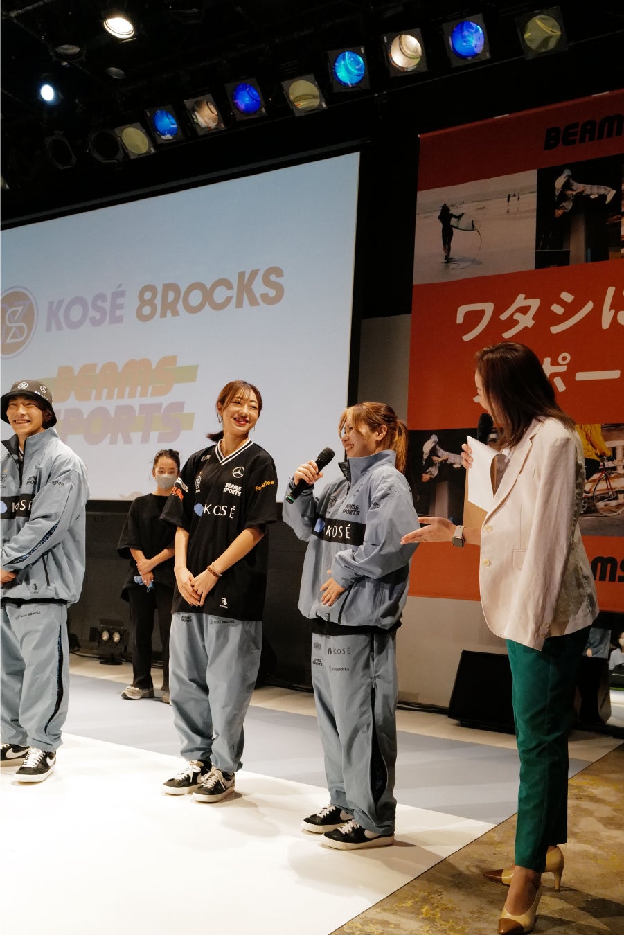 イベント開催前、『KOSÉ 8ROCKS』の選手とビームスのスタッフがペアになりビームスの店舗でコーディネート組みを行いました。そのコーディネートを着用し登場した選手たちはそれぞれにお気に入りポイントをコメント。COCOA選手は「来年二十歳になるので、普段と違って大人っぽいイメージでコーディネートしました」とコメントし、ファンからは「可愛い!」という反応が飛び交いました。