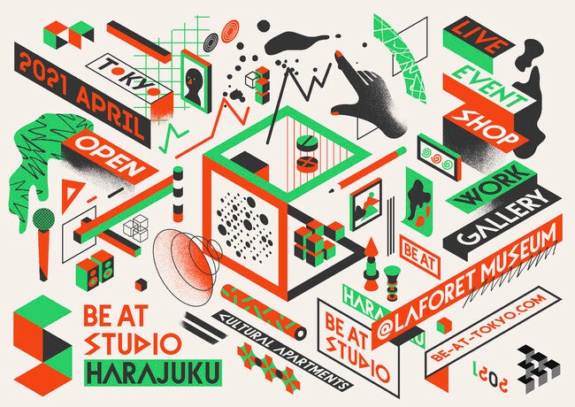 この場所は株式会社ビーアットのプラットフォーム、「BE AT TOKYO」のウェブサイトと連動した、「LIVE」「GALLERY」「EVENT」「WORK」「SHOP」といったコンテンツを展開していくことで、表現者が集まり、混ざり合い、創造するリアルな場所です。