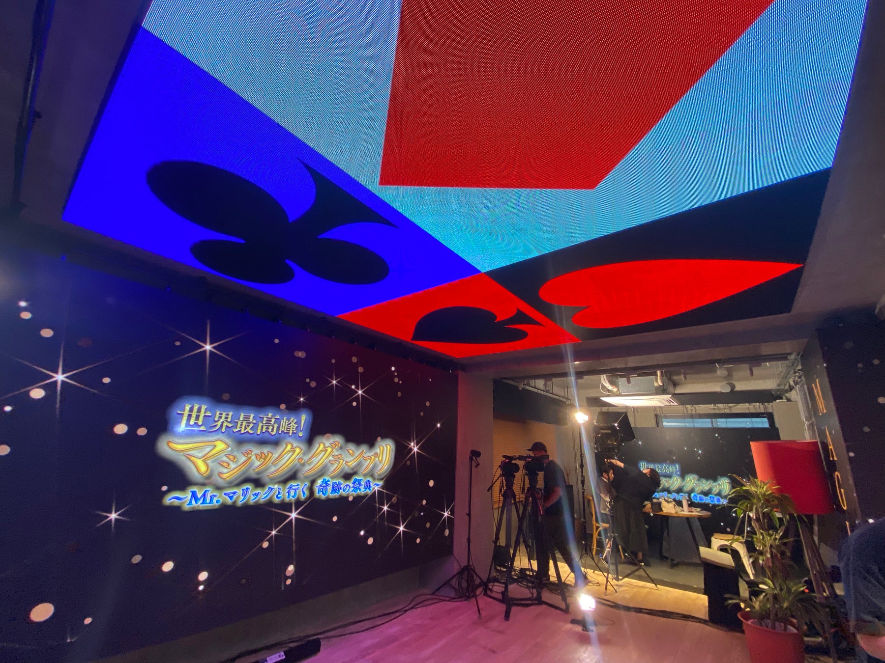 壁面と天井、柱に設置してあるLEDビジョンに番組ロゴや、トランプのマークを放映するなど「マジック」を表現する空間になりました。壁面の大型LEDビジョンでは、世界各国から集められた最高峰のマジック映像を放映し、大画面でマジック映像を楽しむ演出が行われました。