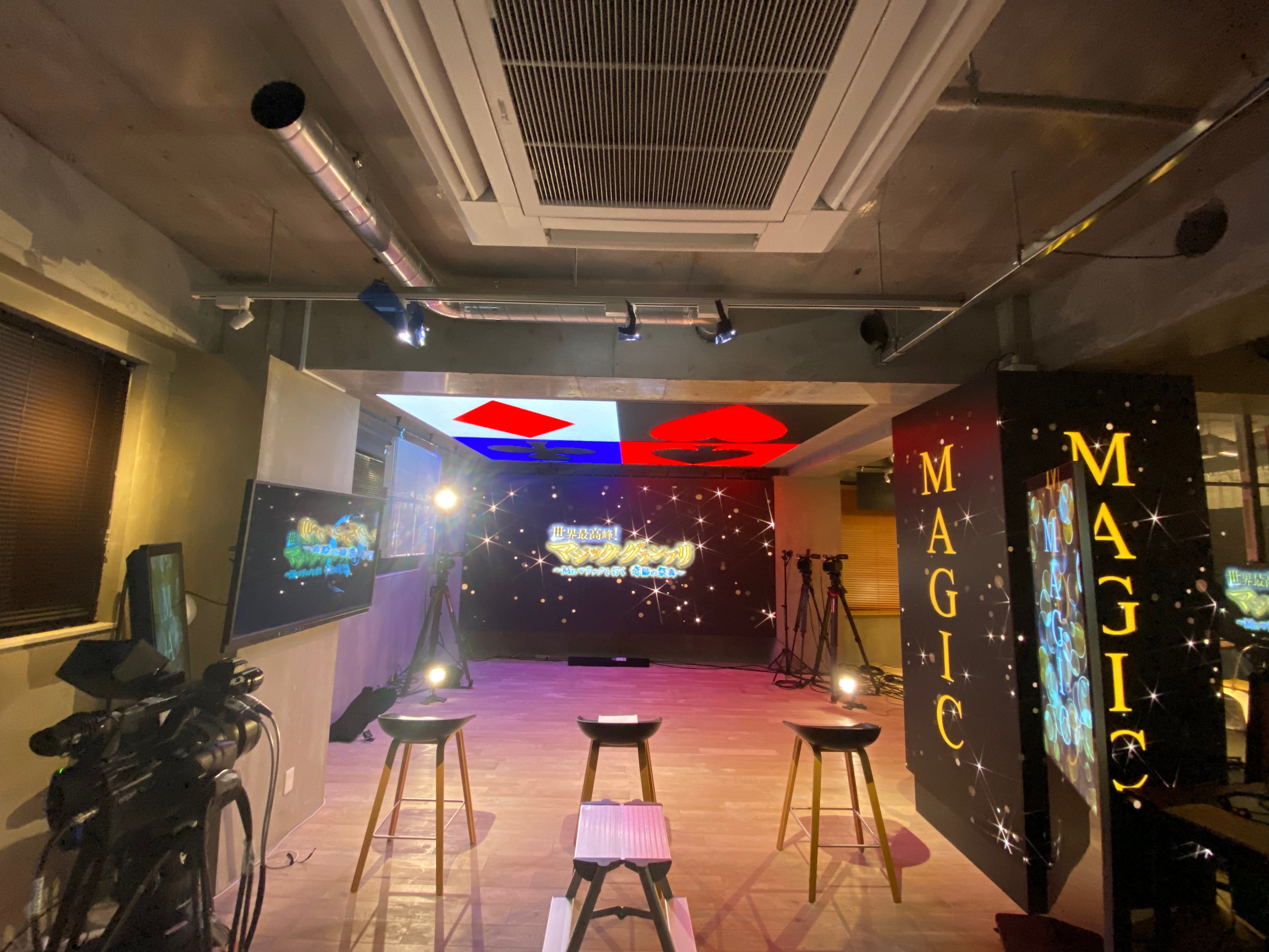 壁面と天井、柱に設置してあるLEDビジョンに番組ロゴや、トランプのマークを放映するなど「マジック」を表現する空間になりました。壁面の大型LEDビジョンでは、世界各国から集められた最高峰のマジック映像を放映し、大画面でマジック映像を楽しむ演出が行われました。