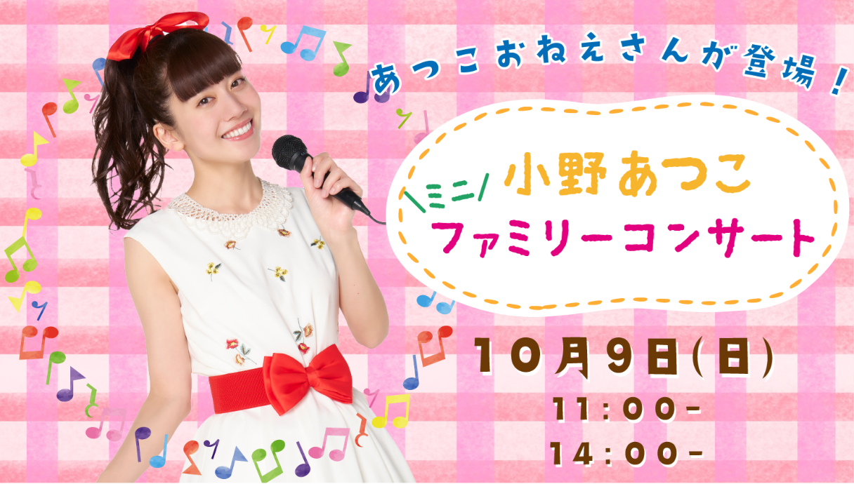うたのおねえさんでお馴染みの“あつこおねえさん”が、北関東の遊園地では初となる、ファミリーコンサートを10月9日(日)に開催。