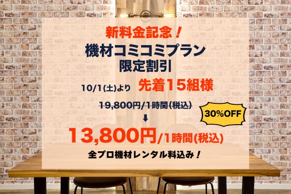 「機材コミコミプラン」を先着15組限定30%割引13,800円(税込)でご提供いたします。