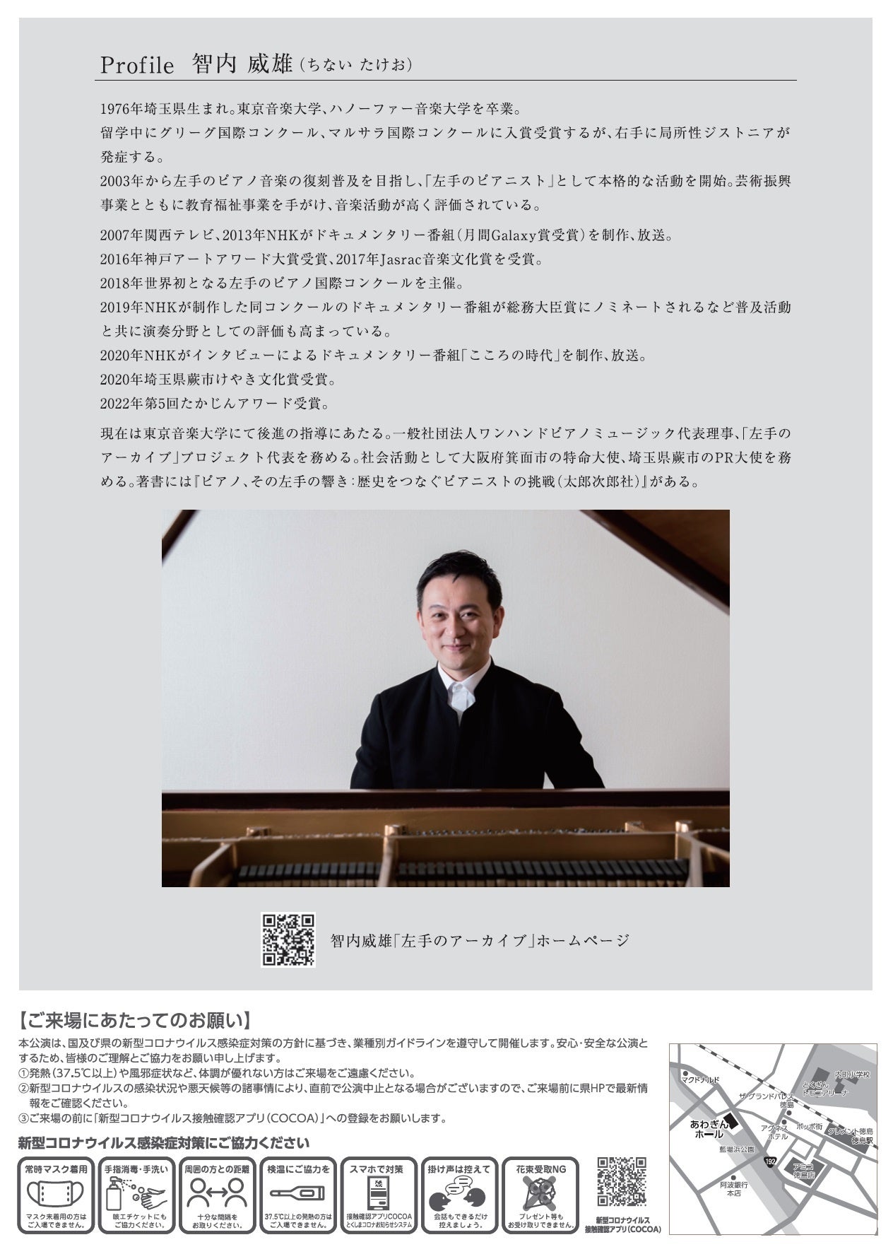 智内氏は、ドイツ・ニーダーザクセン州にあるハノーファー音楽大学で研さんを積み、将来を嘱望される中で、右手に難病・局所性ジストニアを発症。リハビリ後は、「左手のピアニスト」として活躍されています。