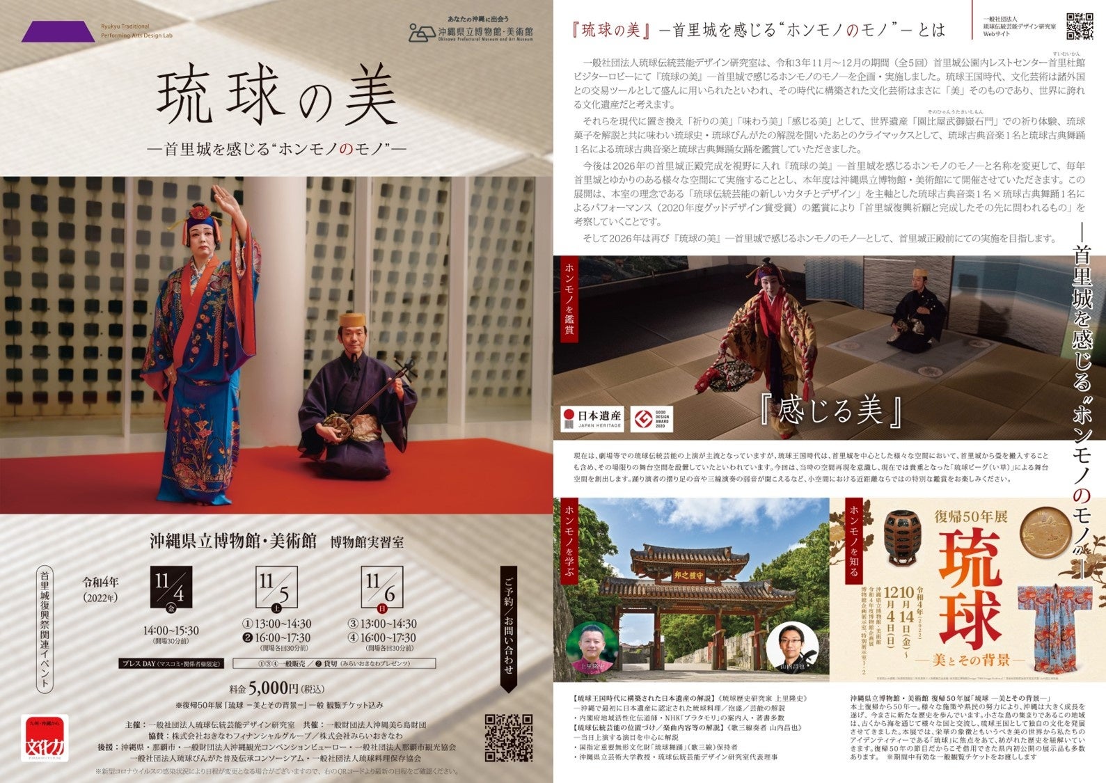 一般社団法人琉球伝統芸能デザイン研究室(代表理事:山内昌也、本社:沖縄県那覇市)は、琉球王国時代に構築された高貴な文化芸術を「首里城とゆかりのある空間でリデザイン」をコンセプトに、『琉球の美』- 首里城を感じる”ホンモノのモノ”- を沖縄県立博物館・美術館にて上演いたします。