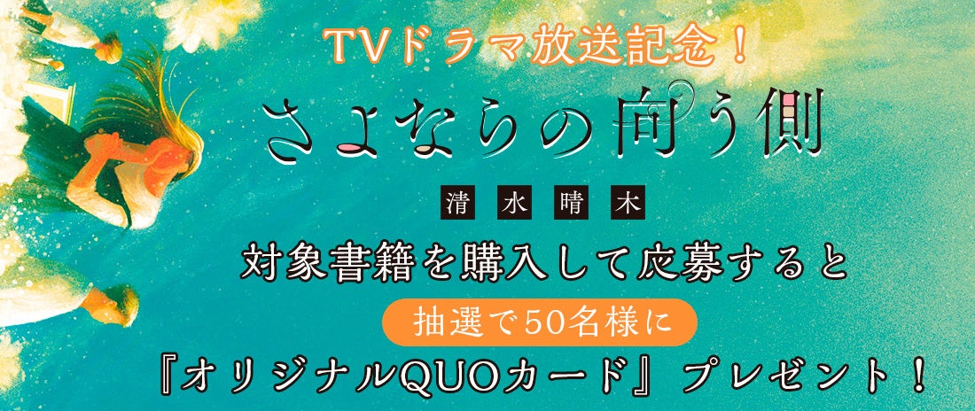 TVドラマで案内人を演じる上川隆也さんのキービジュアルが印刷されたドラマ帯の『さよならの向う側』『さよならの向う側 i love you』をお買い上げいただき、帯についている応募券をハガキに貼ってご応募いただいた方の中から抽選で50名様に「オリジナルQUOカード」(500円分)をプレゼントいたします。