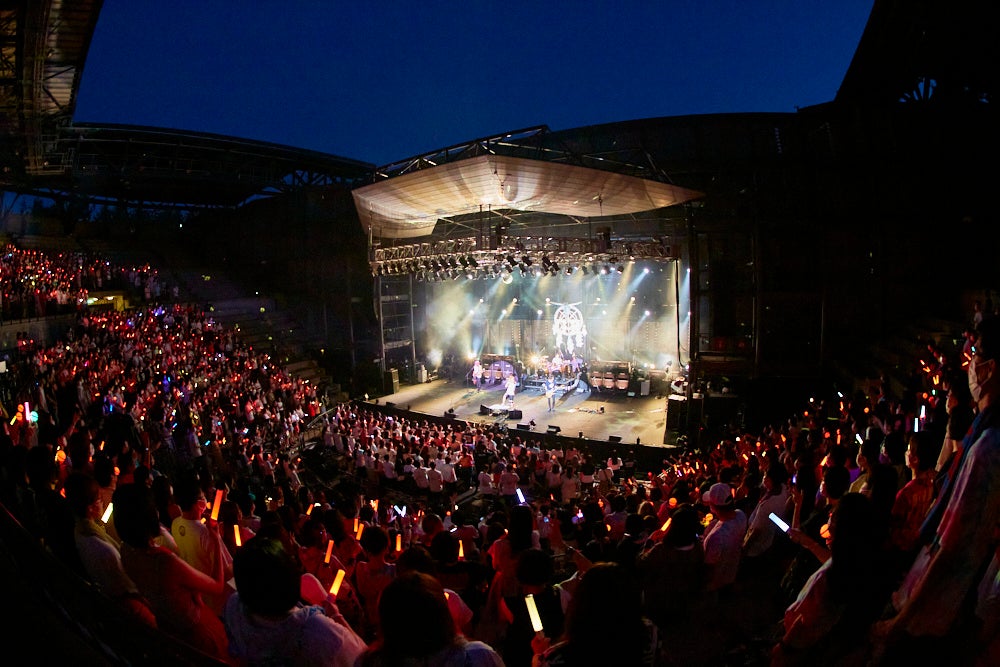 富士の麓、山梨・河口湖ステラシアターでGRANRODEOのパーティーチューンが弾けるスペシャル公演。この野外ホールは、古代ローマ劇場をイメージし、クラシック音楽の演奏会も行なわれる抜群の環境を持つ、多くのトップアーティストから支持される人気の会場でもある。