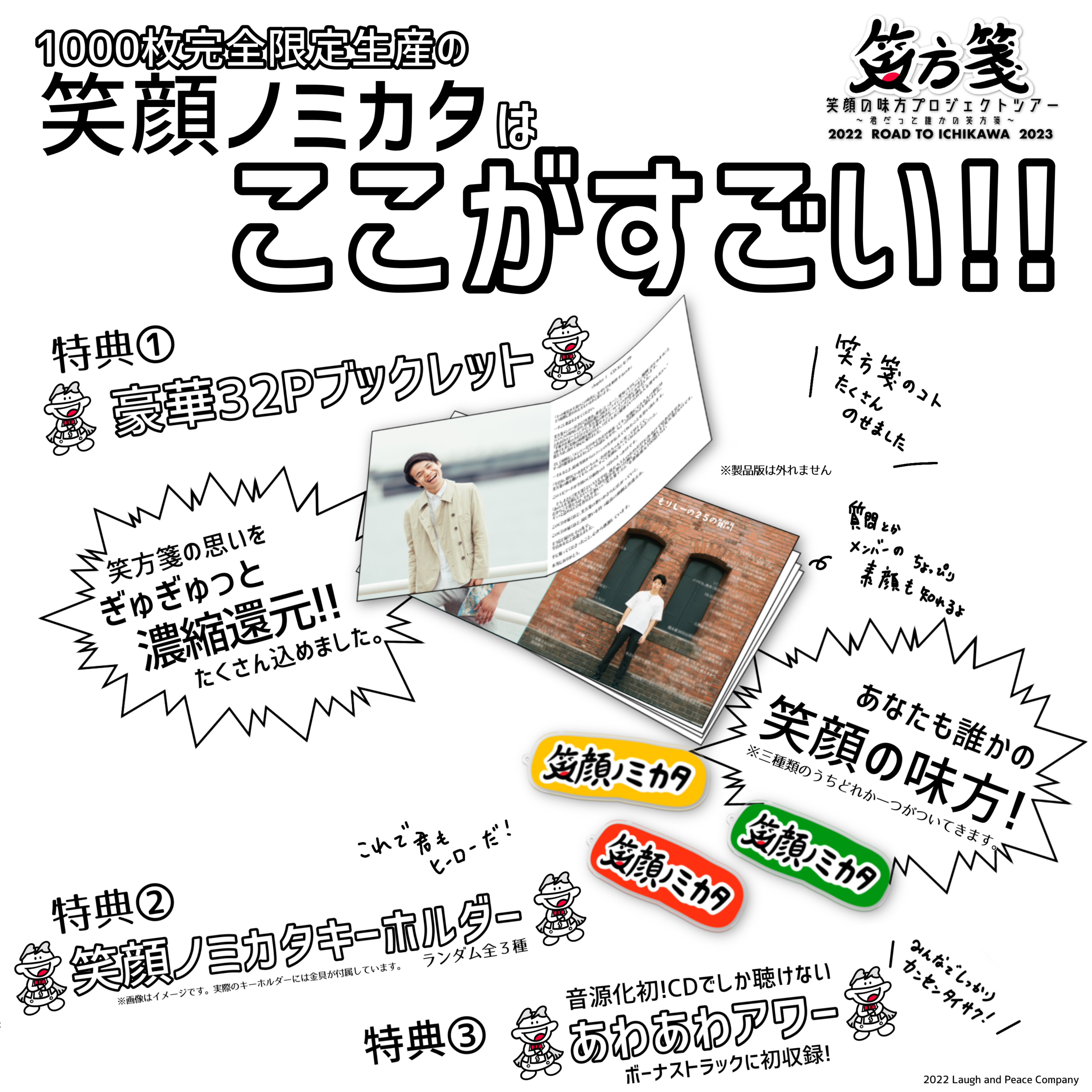 初リリースのCDには笑方箋の楽曲と共に、想いやコンセプトを込めた32ページのブックレットと、仲間の証である『笑顔ノミカタ』キーホルダーを同封。