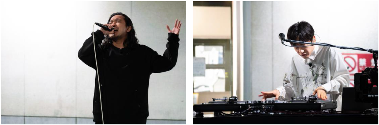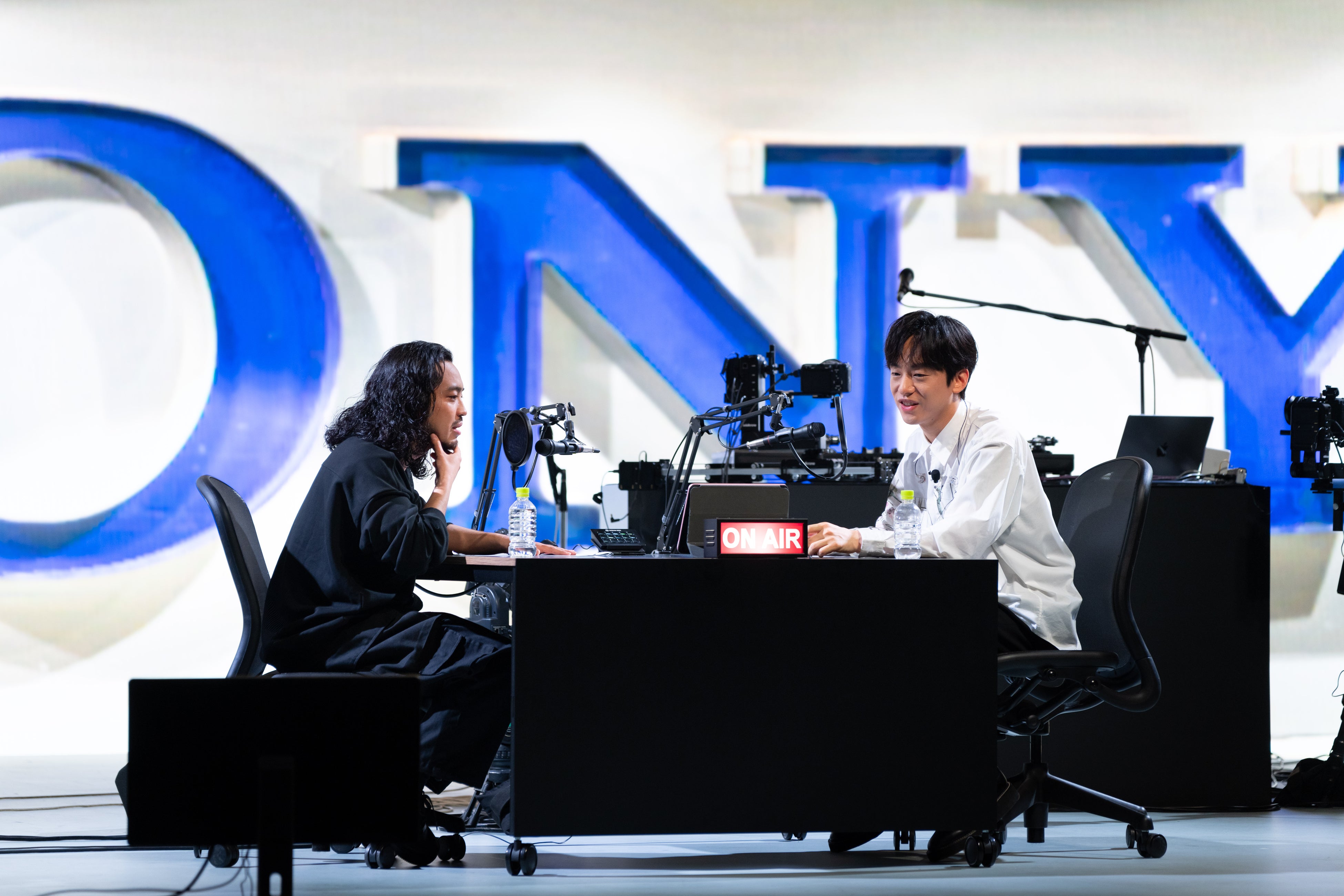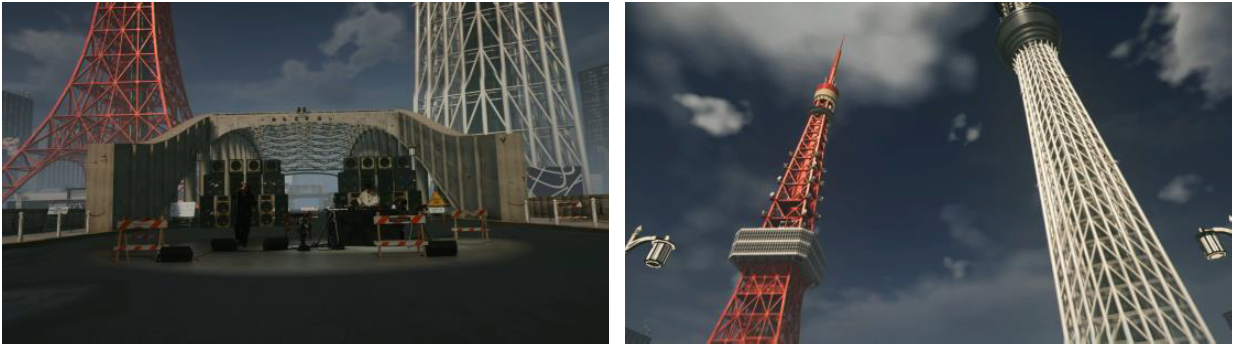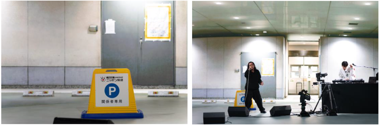 ステージにはラジオブースが置かれ、ライブはトークパートへ。いつものラジオのような会話をテンポよく交わす二人だが、言われなければ分からないほどフォトリアルな3DCGで描かれた駐車場が、まるでロケ撮影をしているかのようにカメラの動きと連動してリアルタイムで変化すると、「すご!いつも買ってる自販機まで3DCGで映るの!?(R-指定)」と、改めてその映像技術に驚く二人。また現在建て替え工事中のGinza Sony Parkの地下をモデリングした背景や、サバンナや夜の街などに自ら切り替えながらトークを展開。月面の背景では「コスモスクラッチだ!」(DJ松永)と楽しげにターンテーブルプレイを見せ、最先端技術とのコラボを彼ら流に楽しんだ。