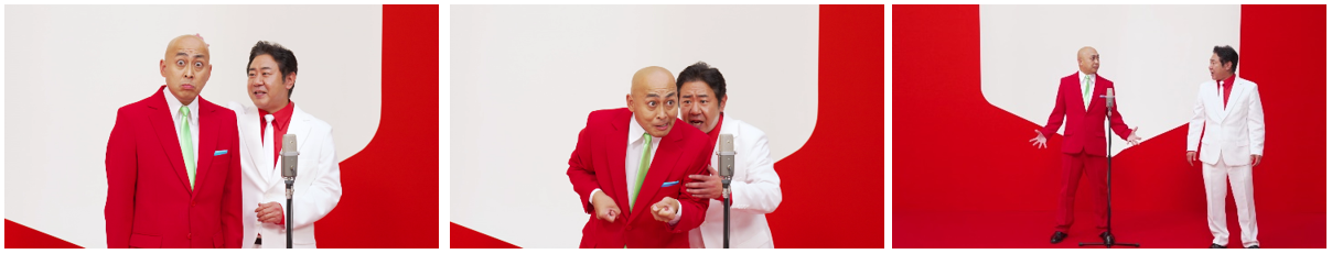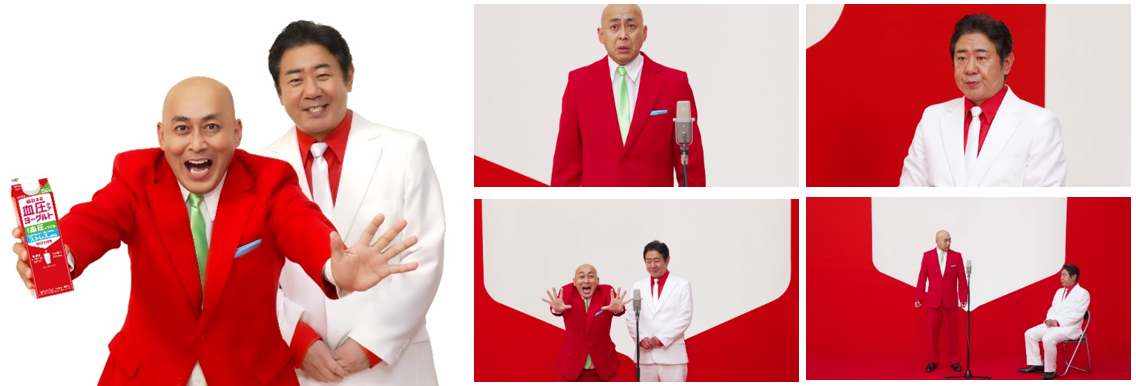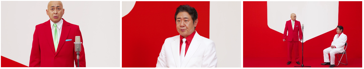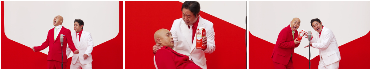 本動画では錦鯉が、M-1グランプリ優勝ネタ「サルを捕まえる」を血圧にやさしいストーリーにリメイクした漫才を披露。中盤にはツッコミに熱が入りすぎて血圧が上がった渡辺さんが、漫才中にもかかわらず椅子に座って息を整えるなど、血圧をケアしながら漫才が進みます。長谷川さんは白のスーツ、渡辺さんは紺色のスーツでおなじみですが、今回は商品と同じ紅白のスーツで登場。いつもと違う漫才の展開や、お二人の装いにご注目ください。
