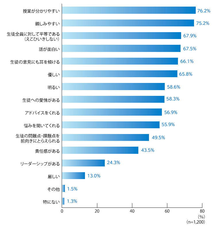 中高生が学校の先生に必要だと思うことは、「授業が分かりやすい」(76.2%)という学習面に関することが最も多く、次に「親しみやすい」(75.2%)という回答が7割を超えています。続いて、「生徒全員に対して平等である(えこひいきしない)」(67.9%)、「話が面白い」(67.5%)、「生徒の意見にも耳を傾ける」(66.1%)、「優しい」(65.8%)、「明るい」(58.6%)、「生徒への愛情がある」(58.3%)という生徒への接し方や人間性・心理面が重視されていました。