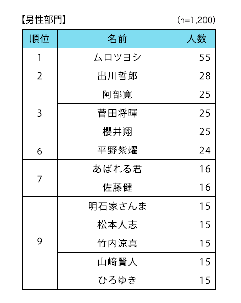●男性1位はムロツヨシさん。楽しそう、面白そうといった選出理由から