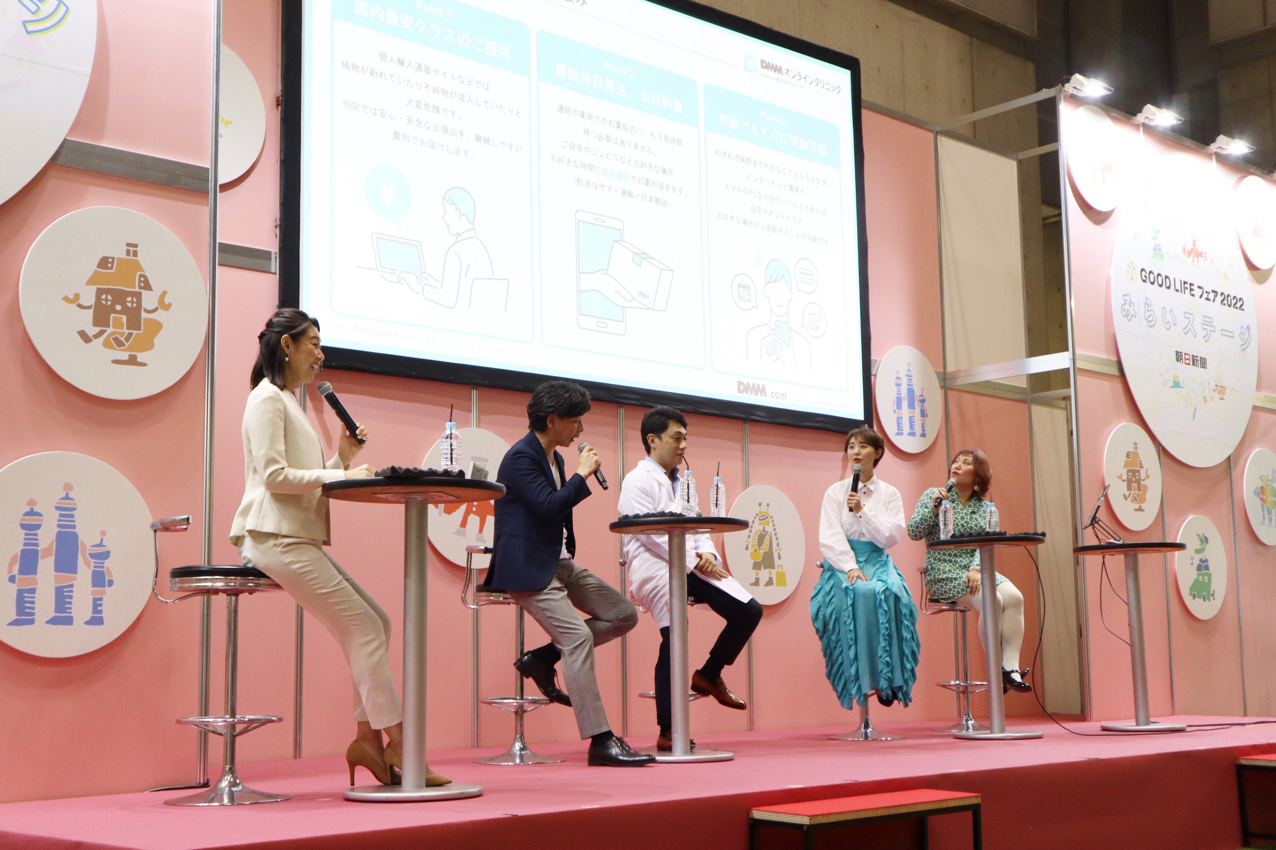 合同会社DMM.com(本社:東京都港区、会長兼CEO 亀山敬司 以下「DMM」)が新六本木クリニック(所在:東京都港区、院長 来田誠)と展開するオンライン診療プラットフォーム「DMMオンラインクリニック」は、2022年9月23日から25日に朝日新聞社が主催する「GOOD LIFE フェア 2022」へ出展、9月25日には同イベント内にてバービーさん、おのののかさん(以下敬称略)をゲストにお招きし、オンライン診療と女性の暮らしをテーマとしたトークショーを開催いたしました。
