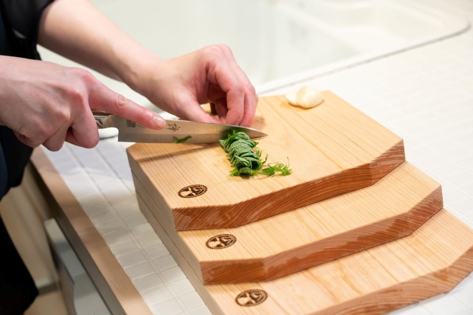 ヒノキには、細菌やカビの増殖を抑制する抗菌・殺菌作用があるとされています。香り成分「フィトンチッド」には自律神経を整え、心身をリラックスさせる効果があることが分かっています。またヒノキのまな板は、プラスチック製と比べて切り心地が柔らかく、長時間の作業でも疲れにくいなど調理器具としても魅力的です。包丁の刃への負担も軽くなります。