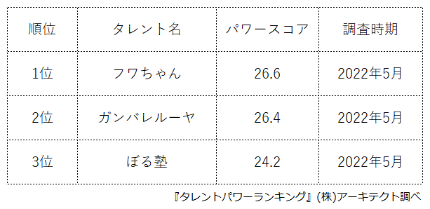 本ランキングは、2022年5月度に実施したタレント調査データ(一部過去実施データ)を利用し、タイトルに応じてランキング形式でまとめたものです。
