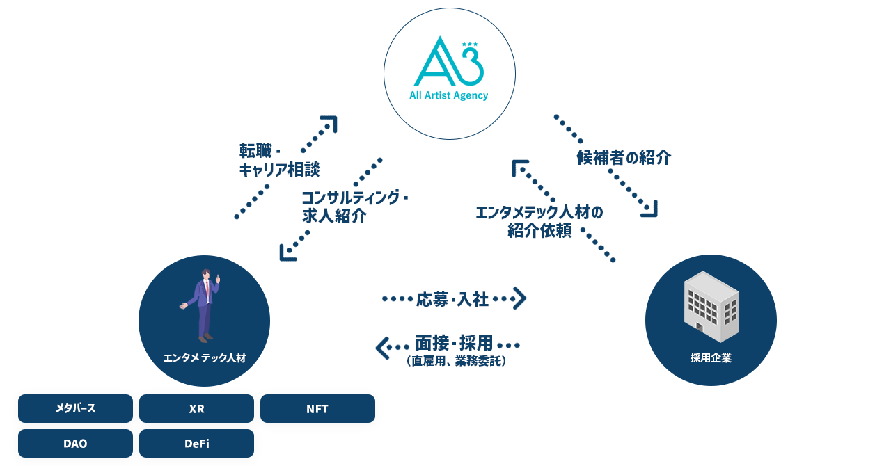 そのような状況の中、これまで一貫してエンタメ領域に多くのネットワークを構築してきたエイスリーでは「エンタメテックに詳しい人材を獲得したい企業」と「エンタメテック企業で働きたい求職者」の適切なマッチングを行い、企業の発展に貢献すべく、エンタメテック特化の人材紹介サービスを開始しました。