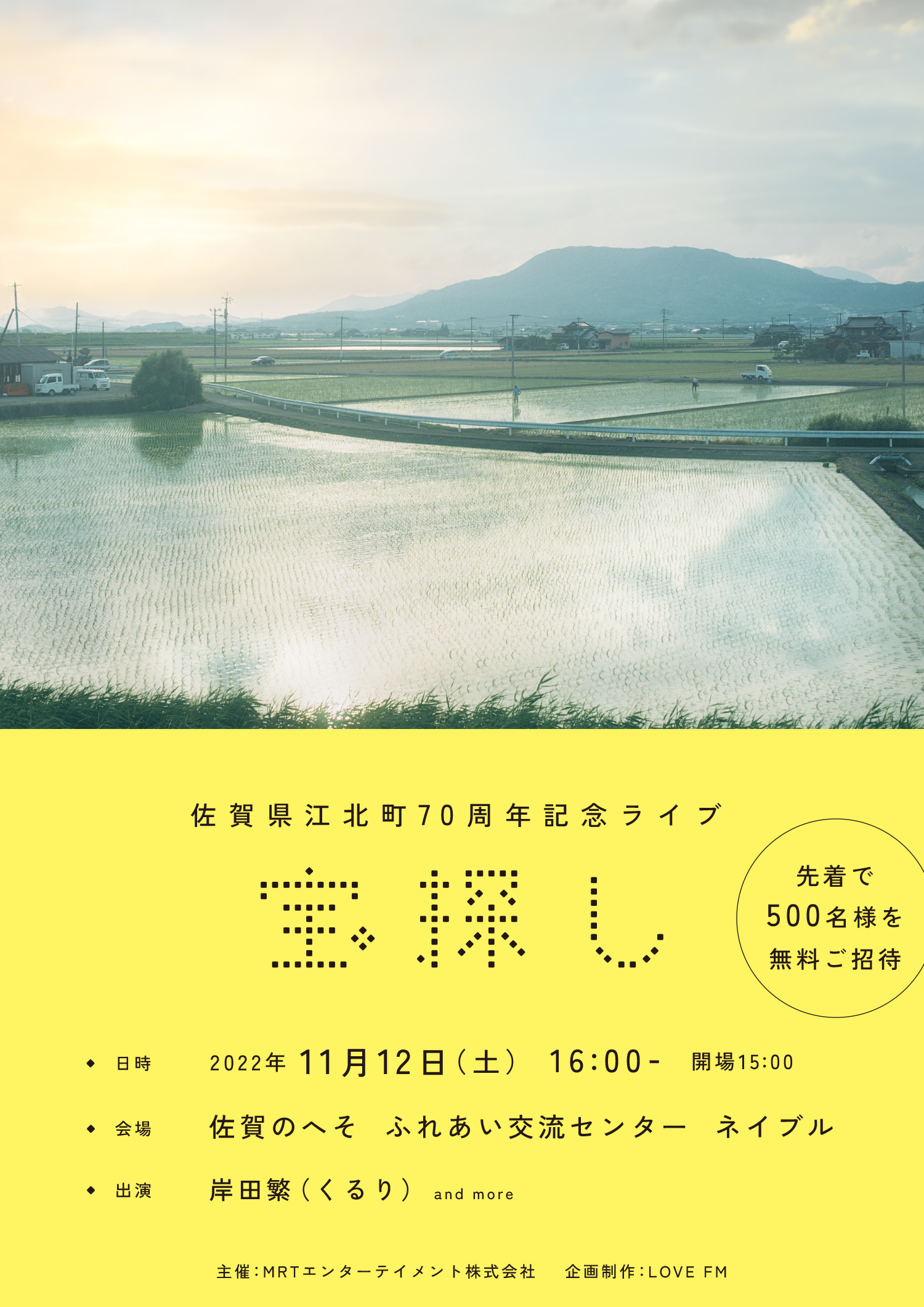 町制70周年を迎えた佐賀県・江北町では、西九州新幹線開業で西九州が大きく注目された今年、町の記念楽曲を人気アーティストくるりに依頼し制作しました。楽曲名は「宝探し」。くるりの2人が実際に町を訪れ、その際に感じた町のイメージを基に書き下ろされた楽曲です。今回はそんなくるりのボーカル岸田繁さんをはじめ、今注目のアーティストとともに、佐賀県江北町70周年記念ライブを実施します。江北町の日常の中にある「宝」をぜひ探しにお越しください。