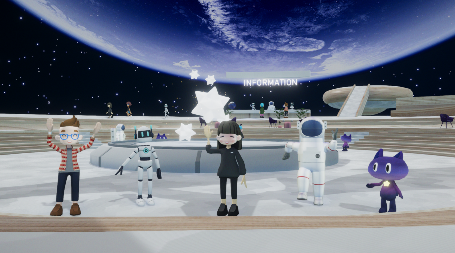 “宇宙を遊ぶ”をコンセプトとしたメタバース空間を初公開します。会場に設置されたQRコードを読み取り、スマートフォンやパソコンのブラウザからアクセスし、アバターを操作することで、宇宙を感じられるメタバース空間でコミュニケーションやアクティビティを楽しめます。アバターはカスタマイズすることも可能です。