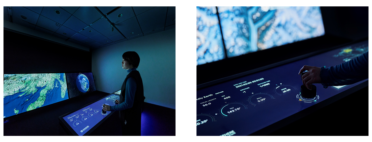 人工衛星のミッションコントロールセンターのようなパネルやディスプレイを持つ撮影シミュレータを操作することで、人工衛星による撮影の魅力を感じることができるコンセプトブースを一般向けに初公開します。STAR SPHEREの最大の特長は、衛星を操作することで、地球や星々などの宇宙の写真や動画を自ら撮影できることです。本ブースでは大画面に映し出さた宇宙や地球の情景を確認しながら自分の撮りたい場面を探し撮影することで、人工衛星からの撮影の疑似体験ができます。なお、実際のサービスはパソコンでの操作を予定しています。