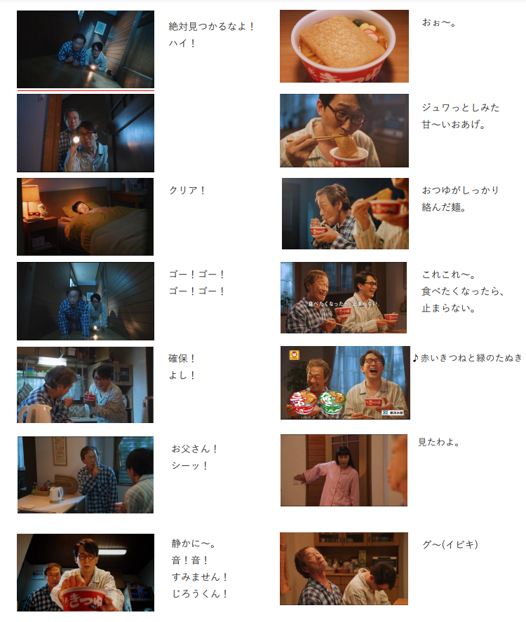 赤いきつね緑のたぬきの“食べたくなったら、止まらない”おいしさを描いた内容となっています。夜遅い時間に奥さんを出し抜いてでも食べたいという欲求を、武田鉄矢さんとシソンヌじろうさんがスパイさながらに息を潜ませ、赤いきつねにたどり着く様子を通して訴求しています。