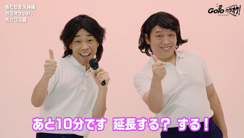 幅広い層に人気のあるお笑いコンビ「COWCOW」にキャンペーンのイメージキャラクターに就任していただきました。人気のネタである「あたりまえ体操」とカラオケがコラボした「あたりまえ体操~カラオケVer~」を「GoToカラオケ」のプロモーションサイトや公式YouTubeチャンネル、各種SNSで配信いたします。店舗限定Verもあるのでぜひチェックしてください。また、Twitterでは「教えて!あなたのあたりまえカラオケキャンペーン」を実施。「盛り上がって、お酒が進みがち」とか「歌い始めたらマイクは離さない」などカラオケあるあるや「歌う前に精神統一」や「週に○○回はいく」などあなただけのあるあるまで広く募集します。あなたの「あたりまえカラオケ」をシェアしてカラオケを盛り上げましょう!
