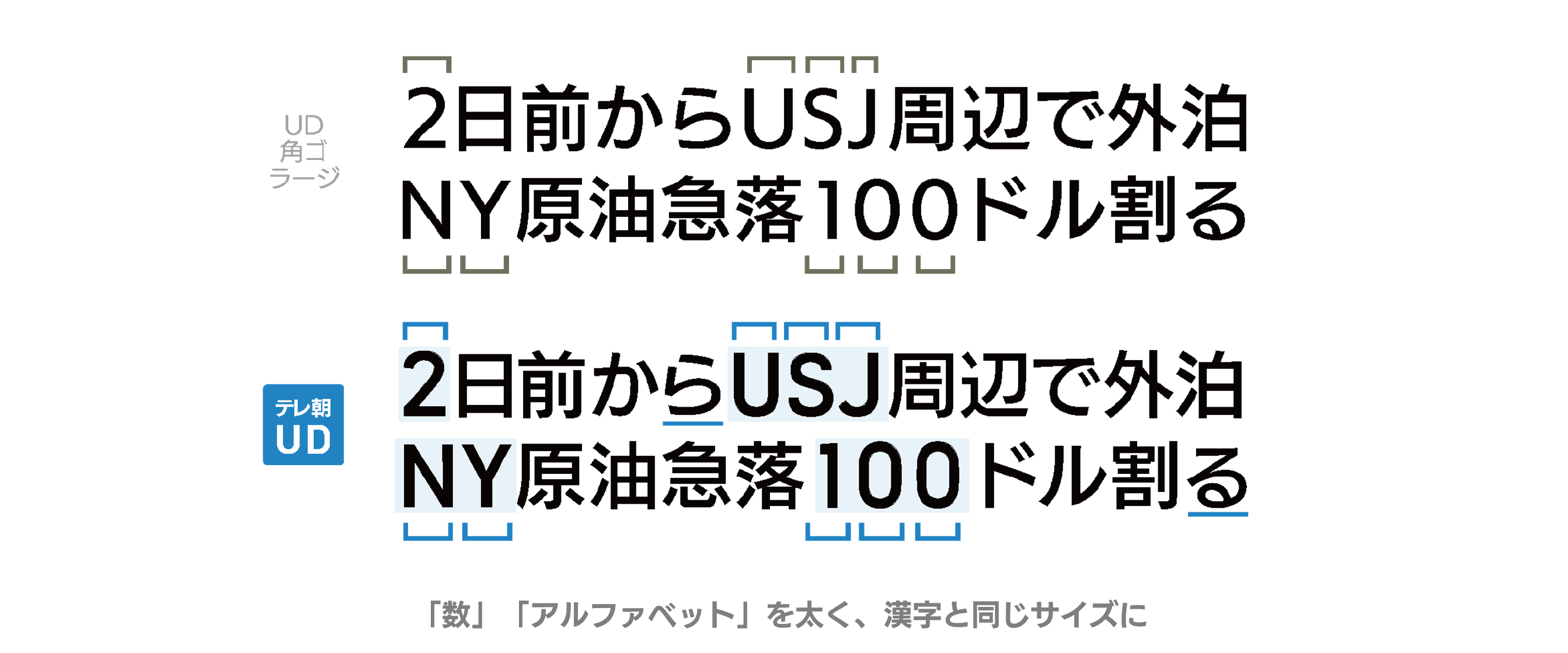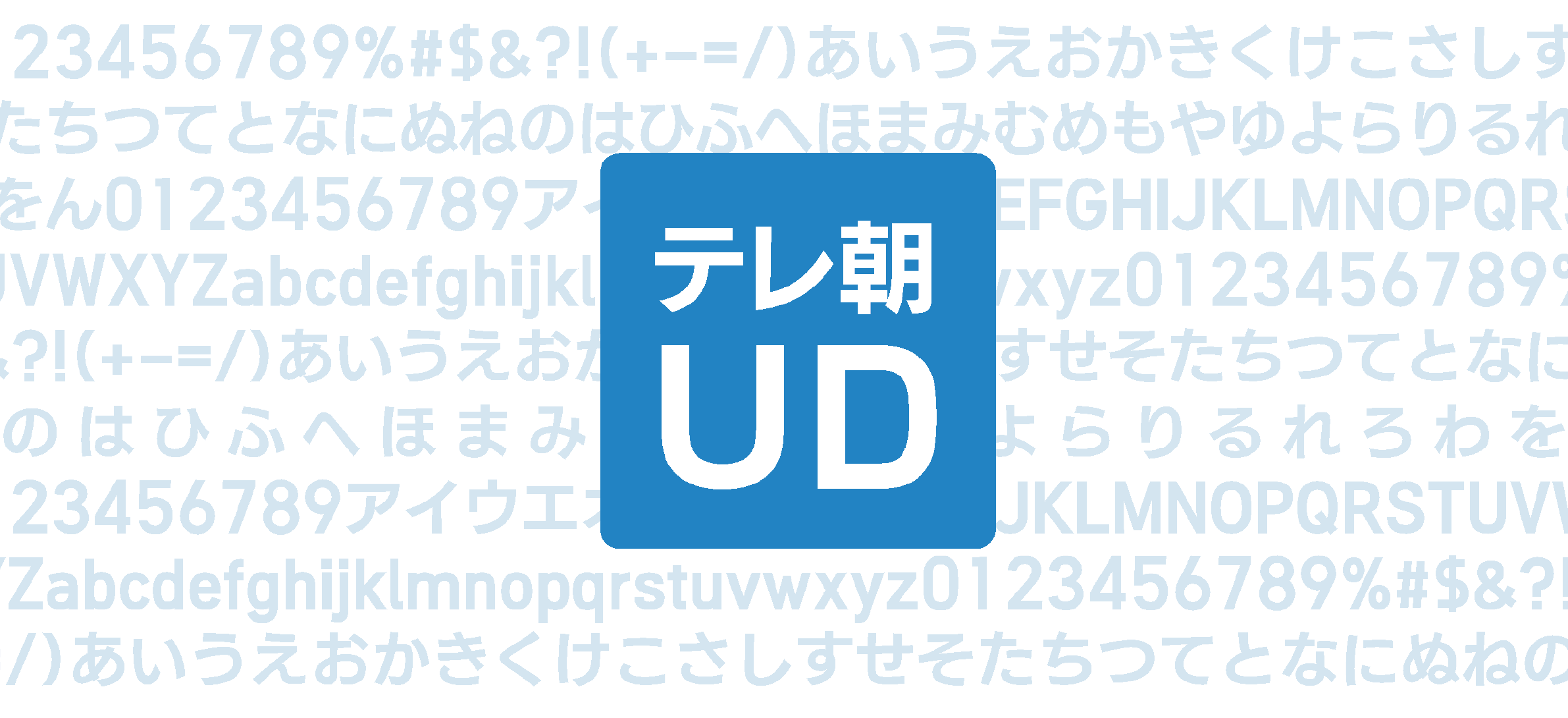 フォントワークスの「UD角ゴ_ラージ」をベースに、UD=ユニバーサルデザインの特性を活かしてテレビ朝日がデザインしたプロトタイプからフォントデータを作成。デバイスを選ばない視認性の高さを追求した結果、様々なデジタルシーンにも適したフォントが完成しました。
