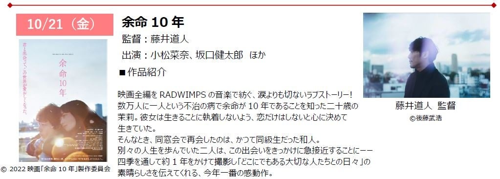 | 【夜間広場コンテンツ】 「第4回 トロント日本映画祭in日比谷」全上映ラインナップが決定!トークセッションでは 『万引き家族』の是枝裕和監督や、『余命10年』の藤井道人監督など、計7名が登壇! |