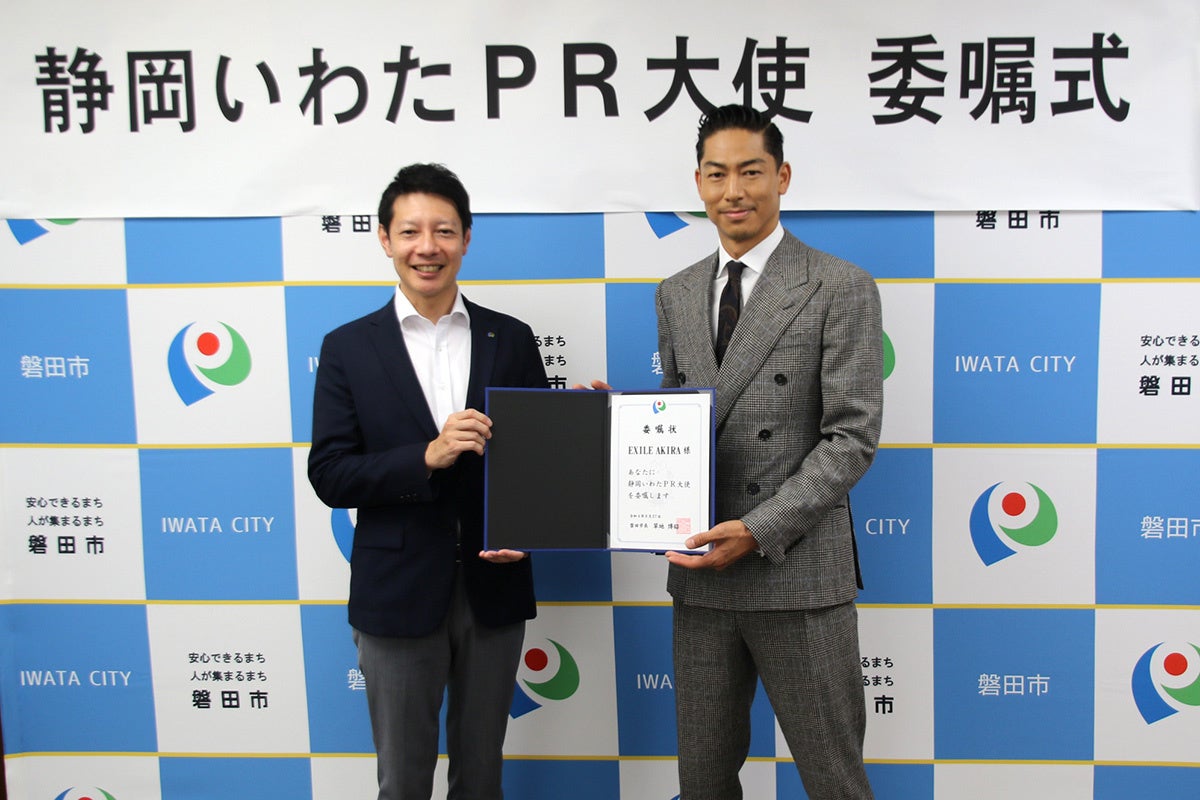 PR大使を代表して、EXILE AKIRAさんが市役所を訪れ、草地市長から委嘱状を手渡しました。