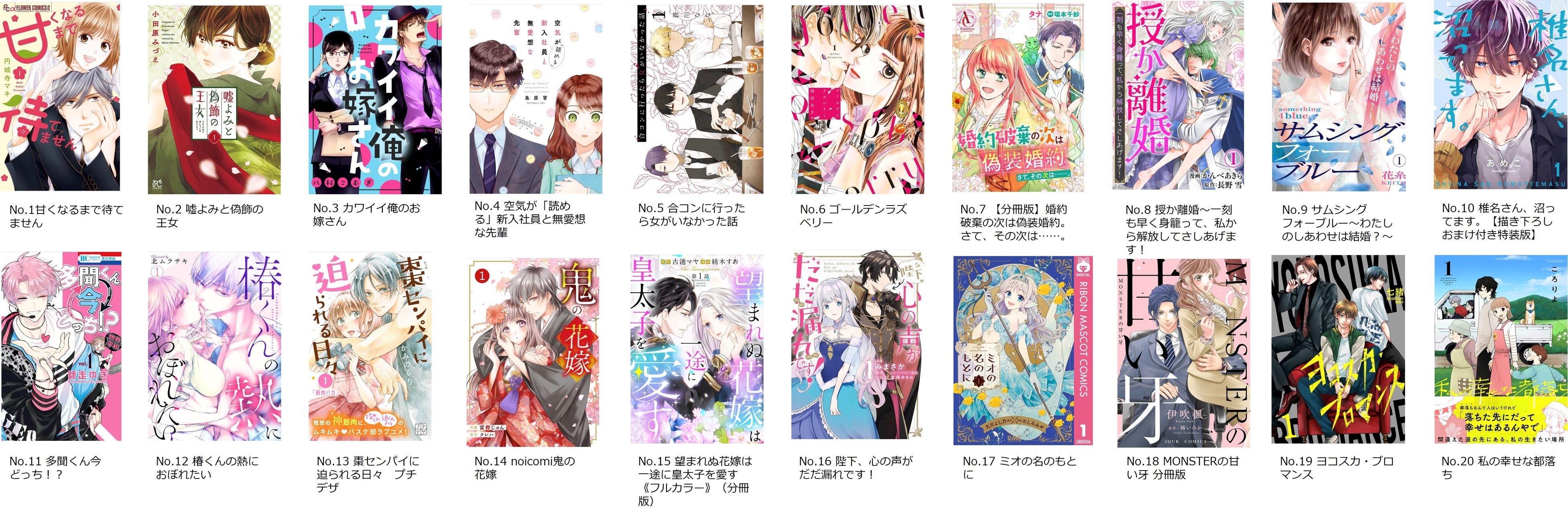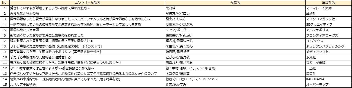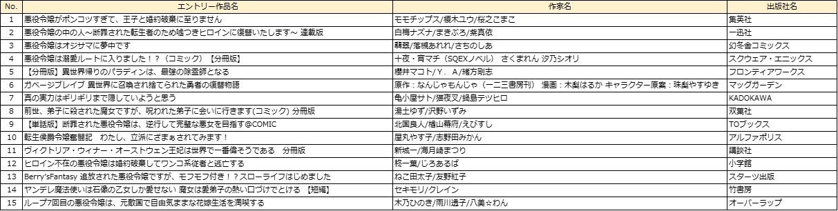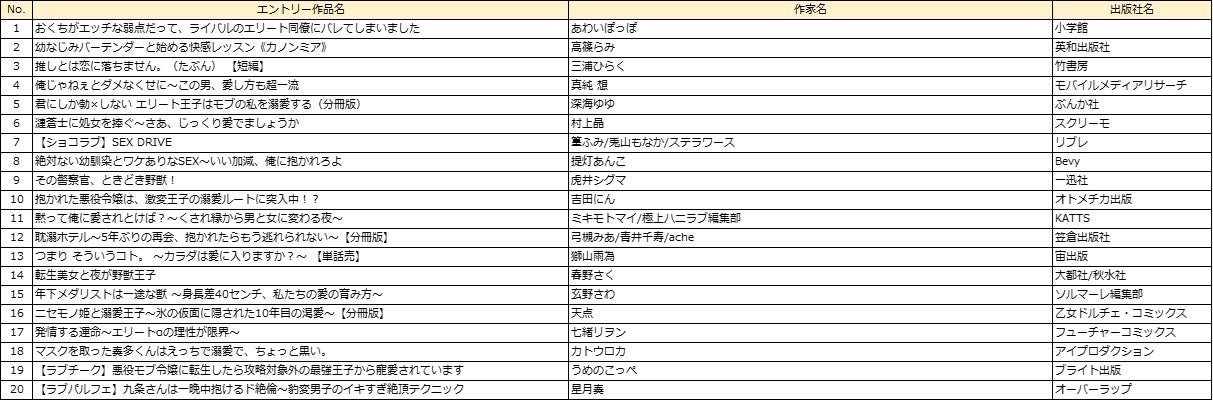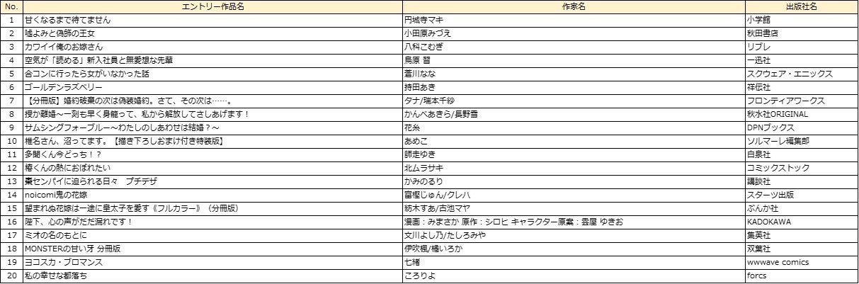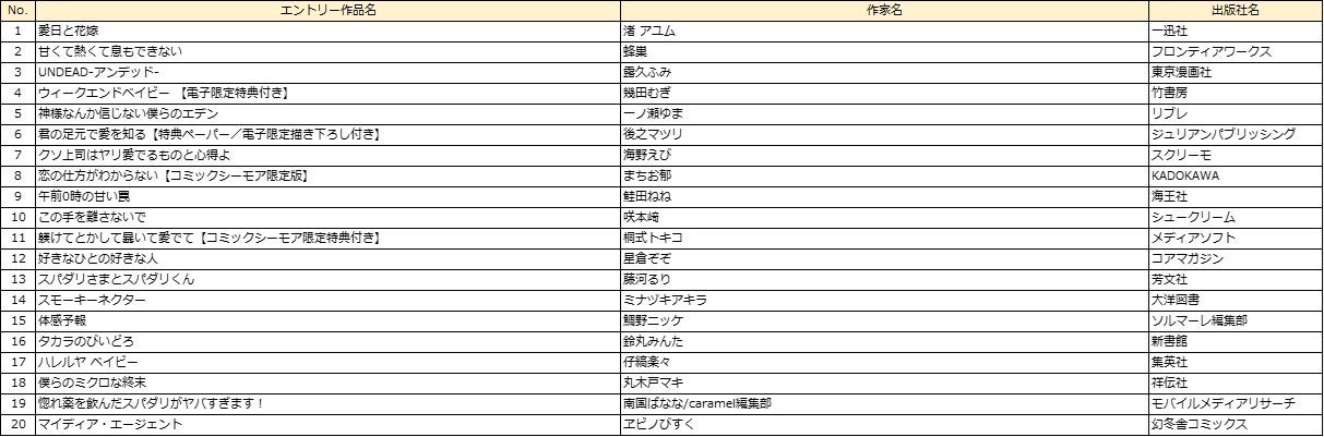 部門 :男性部門、女性部門、異世界コミック部門、ラノベ部門、BL部門、TL部門