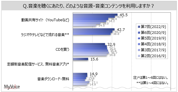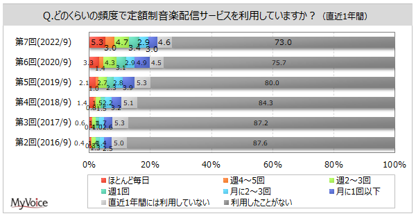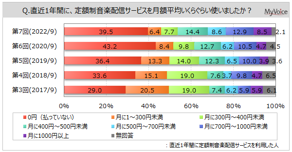 | <今 回>(2022/9)https://myel.myvoice.jp/products/detail.php?product_id=29007 ※上記設問の他に、「定額制音楽配信サービスを利用する機器」も聞いています。 <第6回>(2020/9)https://myel.myvoice.jp/products/detail.php?product_id=26608 <第5回>(2019/9)https://myel.myvoice.jp/products/detail.php?product_id=25407 |