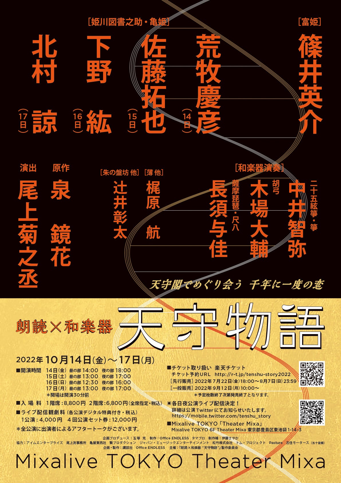 泉鏡花原作の『天守物語』を 2022年10月14日(金)〜10月17日(月)にMixalive TOKYO(ミクサライブ東京)のTheater Mixaにて上演することが決定しました。