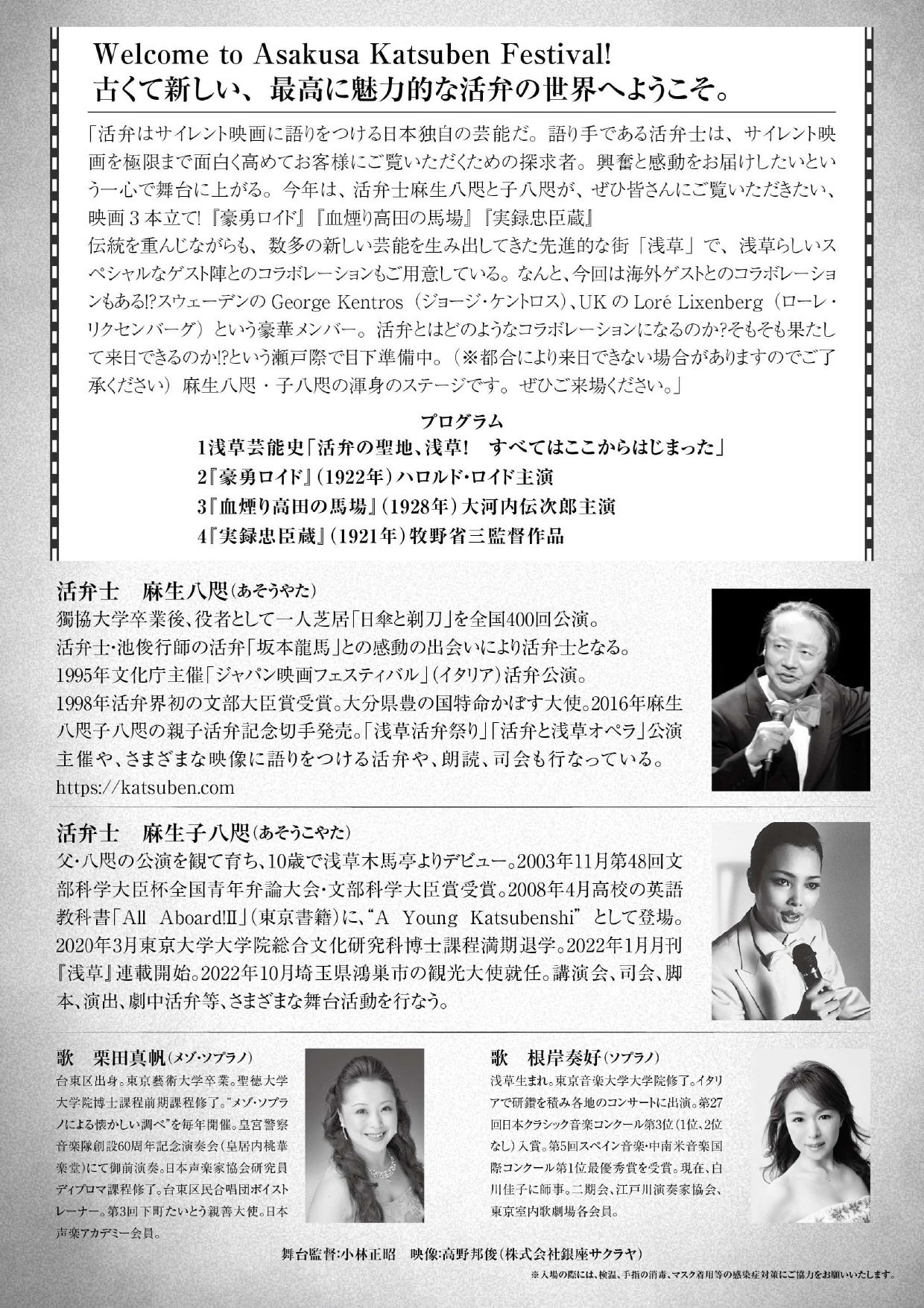 今年は、活弁士麻生八咫と子八咫が、ぜひ皆さんにご覧いただきたい映画3本立て!