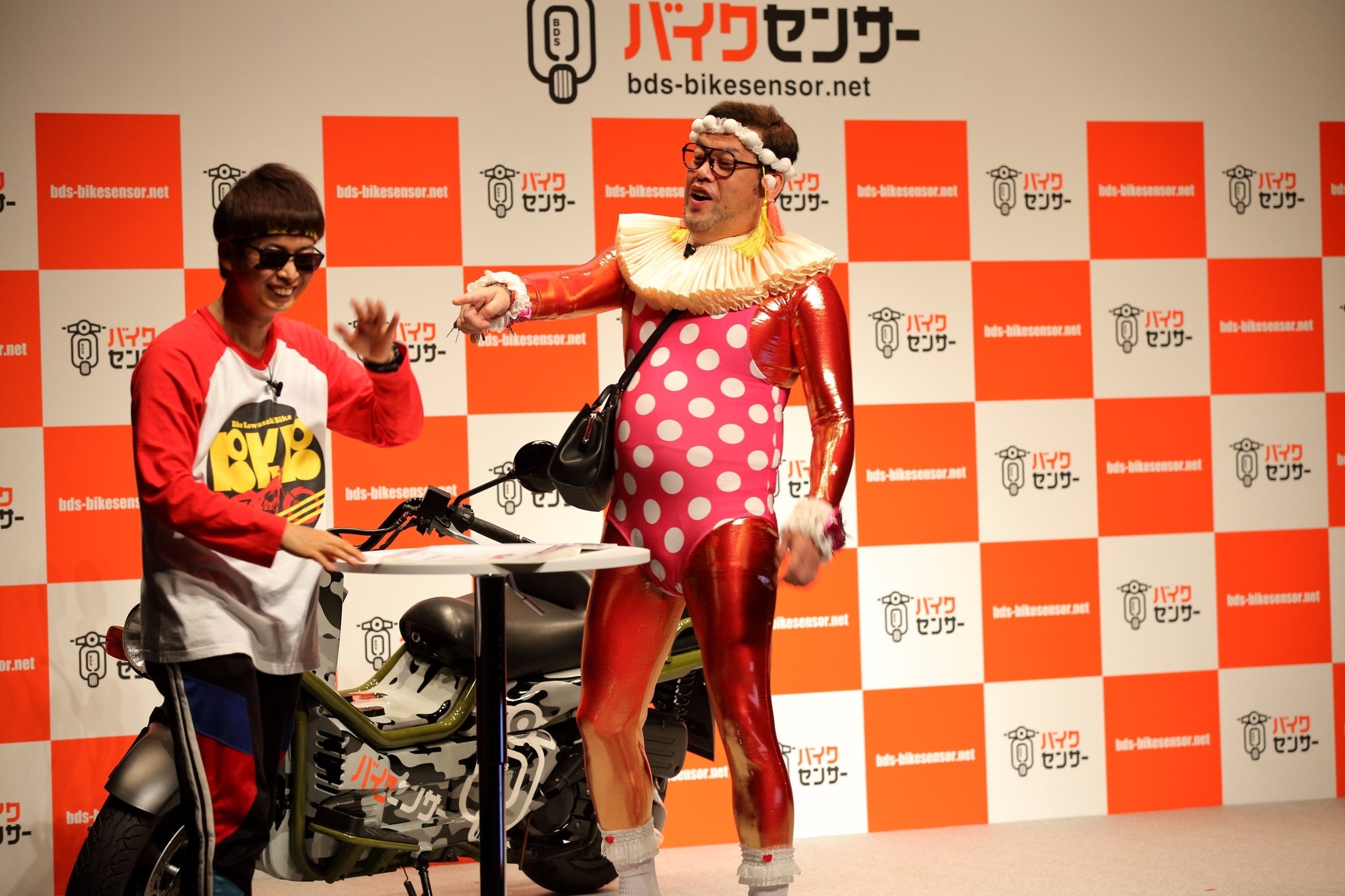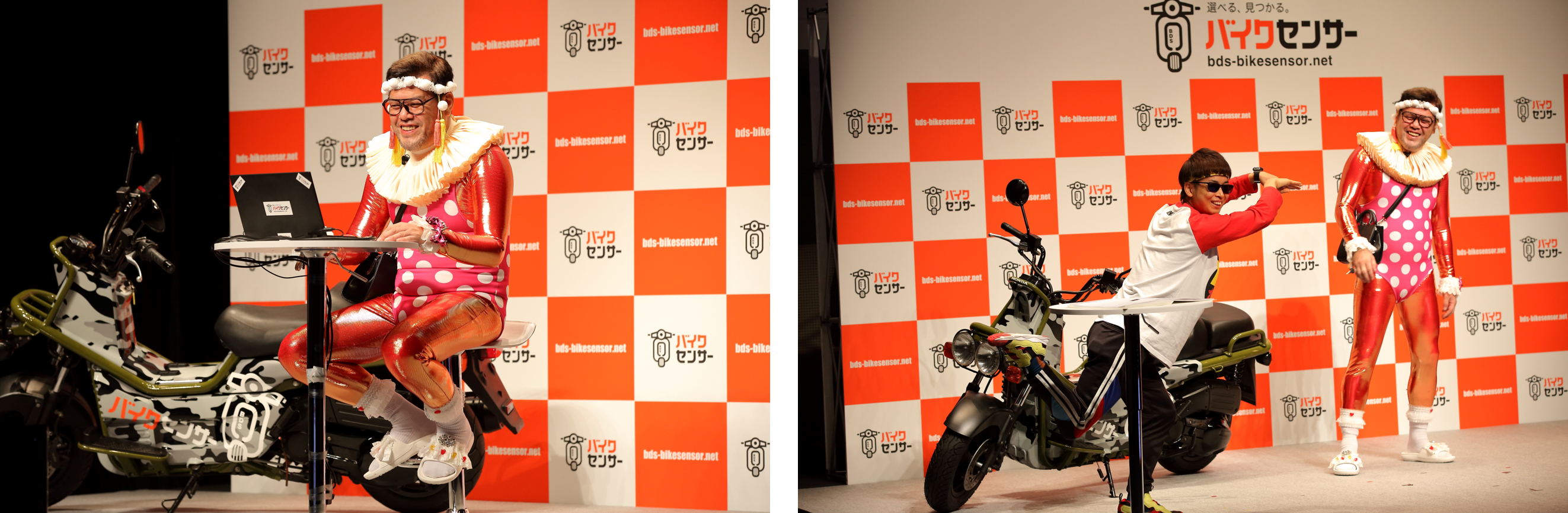 最後には、バイク川崎バイクさんの持ちネタであるBKBになぞって、今回のバイクセンサーを使用した感想を、BDSで表現するように問われたくっきー!さん。お手本を見せるといったバイク川崎バイクさんは「ばっちり(B)大満足で選べる(D)車種(S)」と大きな声で決めポーズ。続いてくっきー!さんからは、「僕ですか(B)出汁は(D)すすりません(S)」とまさかの回答も飛び出し、会場は終始笑いの絶えない様子が続きました。