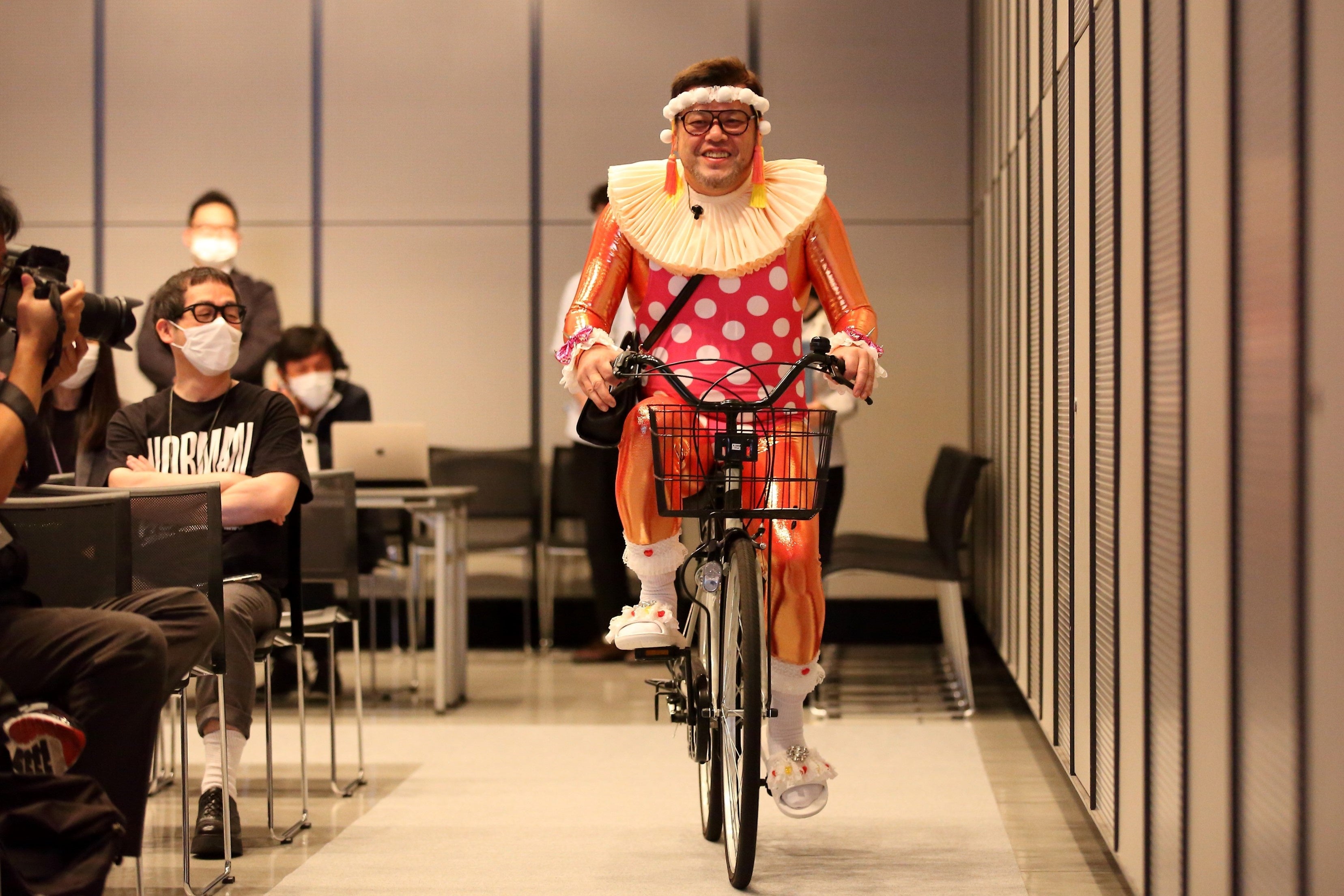 - エンジン音が鳴り響く中、会場に現れたのは”ママチャリ”に乗ったくっきー!さん!