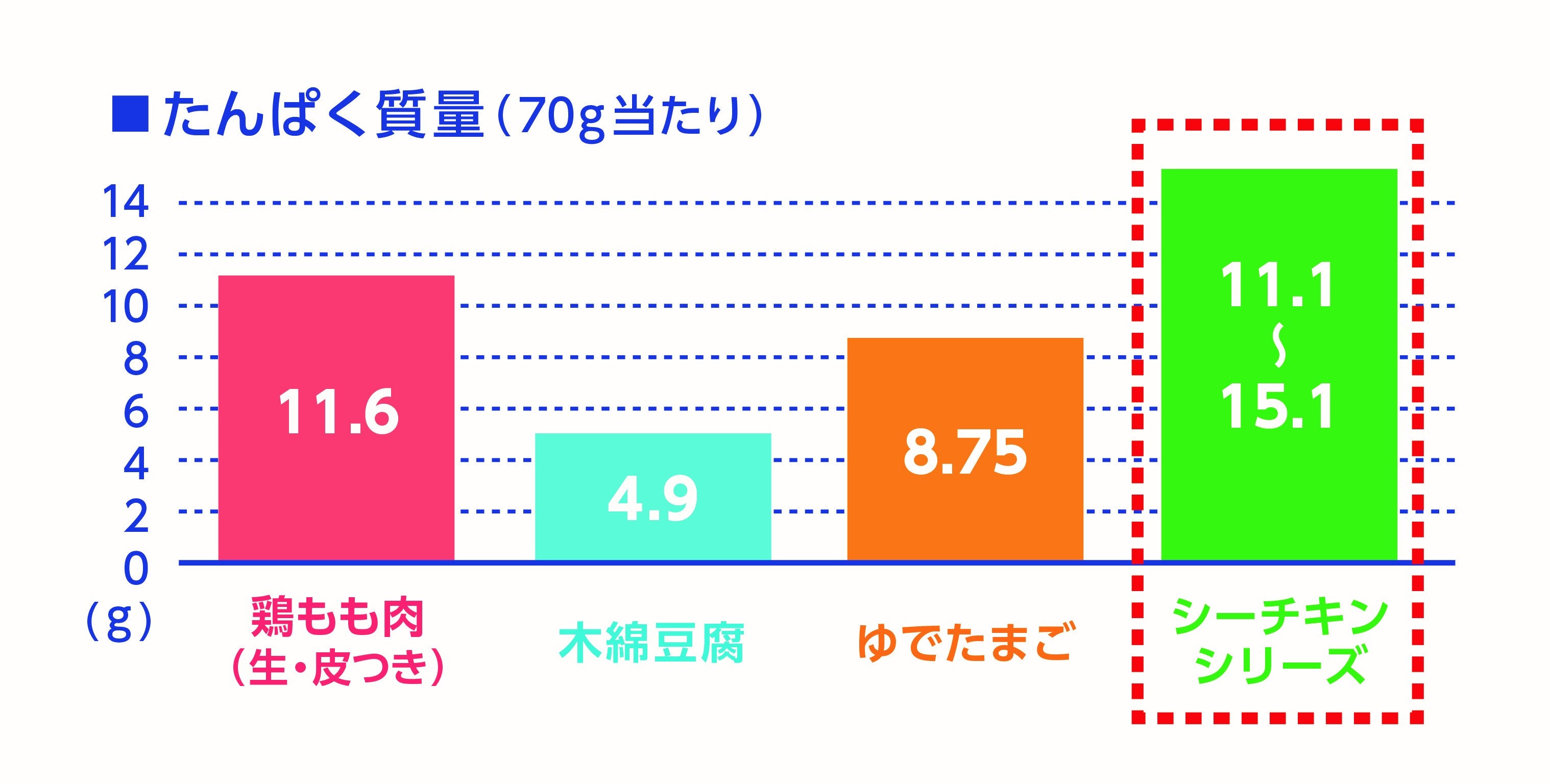 シーチキンシリーズの70g当たりのたんぱく質量は、11.1g~15.1gです。これは、鶏もも肉や木綿豆腐・ゆでたまごのような、たんぱく質が豊富とされる食品と比較しても優秀な値です。