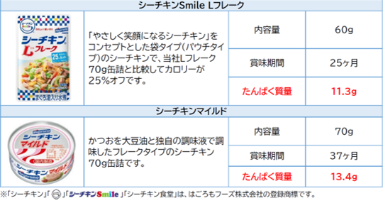 シーチキンは、1958年の発売以来、長く愛されている「はごろもフーズ」を代表する製品です。様々な料理との相性が良く、缶詰1缶(70g)でたんぱく質が11g以上あることも大きな特長で、毎日の食事に取り入れていただくことをお勧めしています。