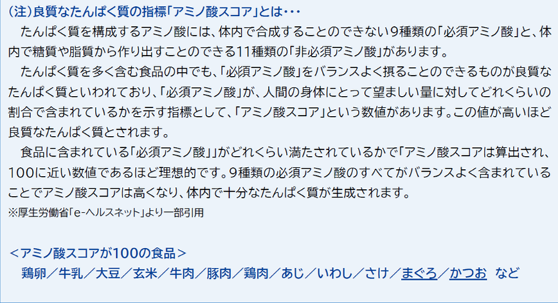 また、原料のまぐろ・かつおは、「アミノ酸スコア100(注)」で、「必須アミノ酸」がバランスよく含まれています。