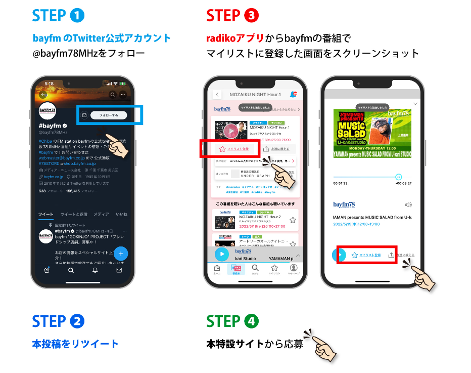 ご当選された方には、「 bayfm 」のTwitter公式アカウント(@bayfm78MHz:https://link.bayfm.co.jp/3HobUgv)よりダイレクトメッセージにて連絡致します。