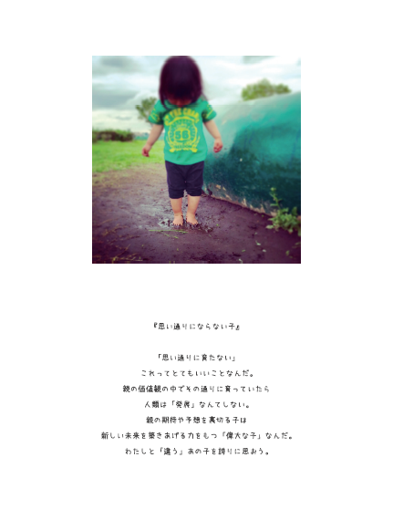 「そんなに頑張らなくて大丈夫 あなたのままの『お母さん』でいいんだよ そのままのその子が素晴らしいんだよ」SNSで育児ママの共感を呼ぶことばを綴る「#みかちゃん」の初著書。我が子に通わせたいと思う保育園を自らの手で創り、多くのこどもたちと接してきた経験から、育児に悩むママへのメッセージを自身の写真と共に綴られた、ママの心のサプリメントとなるメッセージフォトブックだ。