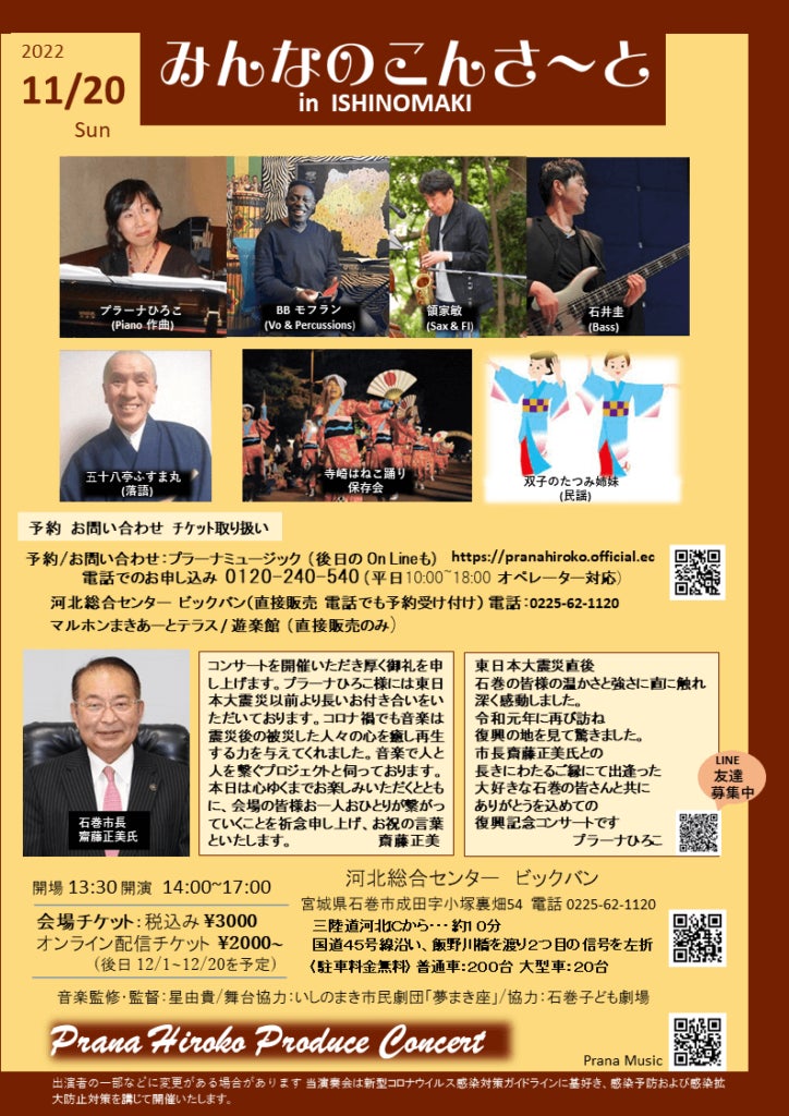 『みんなのこんさ~と in 石巻』が2022年11月20日 (日)に河北総合センター ビッグバン 文化交流ホール(宮城県石巻市成田小塚裏畑54)にて開催されます。