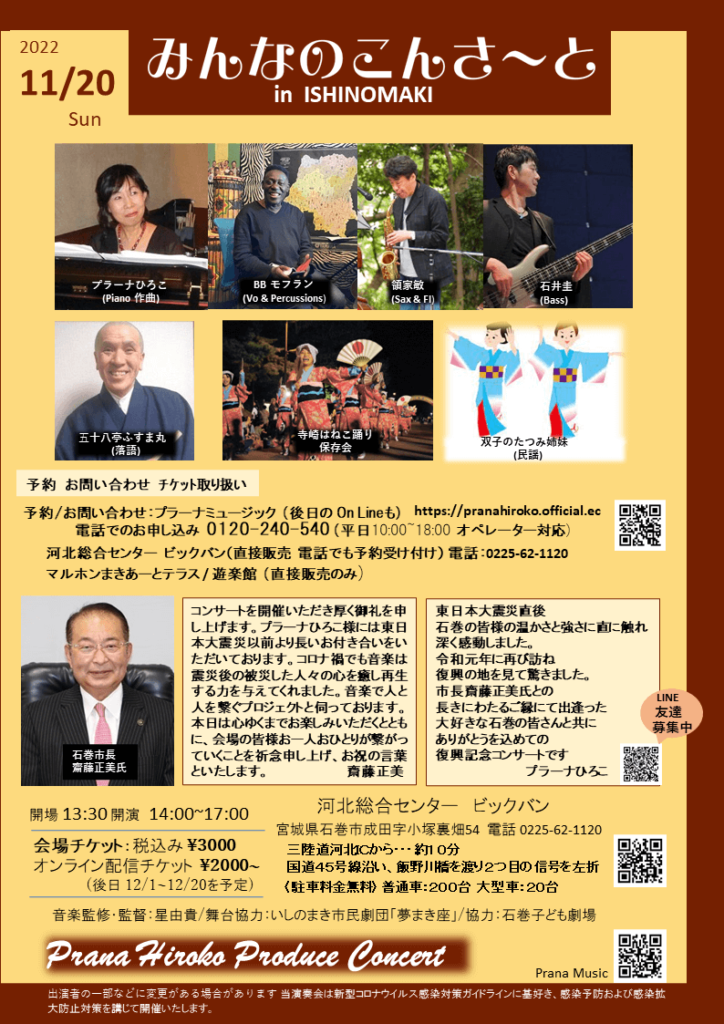 現市長 齋藤正美との長きにわたるご縁にて出逢った大好きな石巻の皆さんと共に“ありがとう”を込めての復興記念コンサートです。