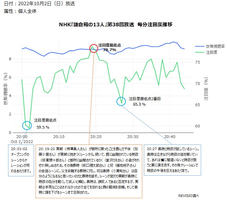 ご家庭に人体認識技術を搭載した機器を設置し、テレビスクリーンの「視られている量」を測るREVISIO株式会社(2022/10/1にTVISION INSIGHTSから社名を変更、所在地 :東京都千代田区、代表取締役社長 郡谷 康士、以下REVISIO)は、2022年1月にスタートした、三谷幸喜さん脚本・小栗旬さん主演の『鎌倉殿の13人』を、毎放送回、視聴者がどのシーンに注目したのかを分析しています。
