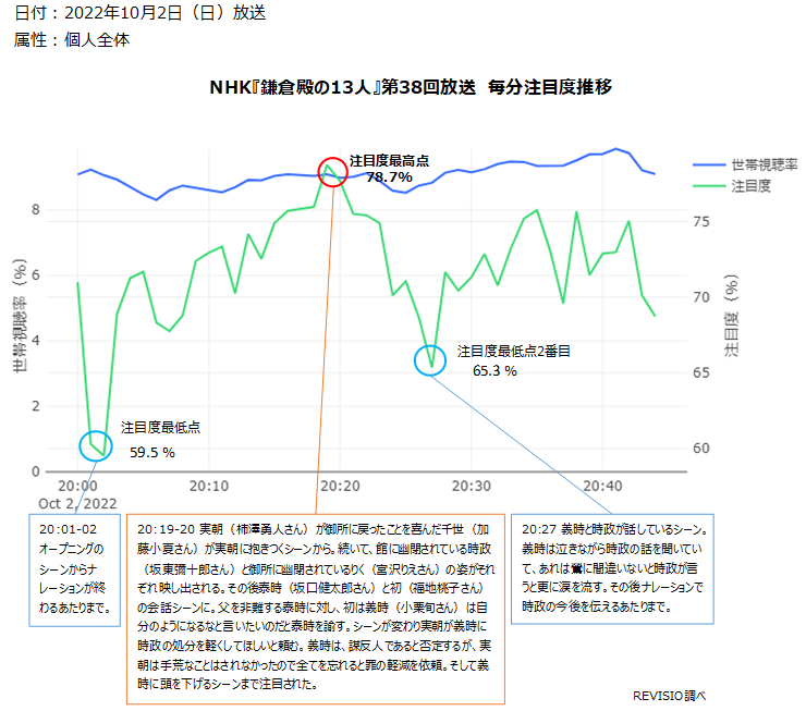 次に注目度が低かったシーン20時27分で、65.3%でした。義時と時政が話しているシーンです。義時は泣きながら時政の話を聞いていて、あれは鶯に間違いないと時政が言うと更に涙を流します。その後ナレーションで時政の今後を伝えるあたりまででした。SNSではコメントが多く寄せられたシーンでしたが、重要な話は終わり話題が逸れてしまったため注目が下がってしまったものと考えられます。