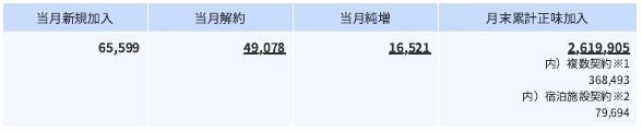 ※2:宿泊施設の客室で視聴するための宿泊施設事業者との契約については、視聴料金を個別に定めており、当該宿泊施設における契約客室の累計正味加入件(室)数は、月末累計正味加入件数に含めております。