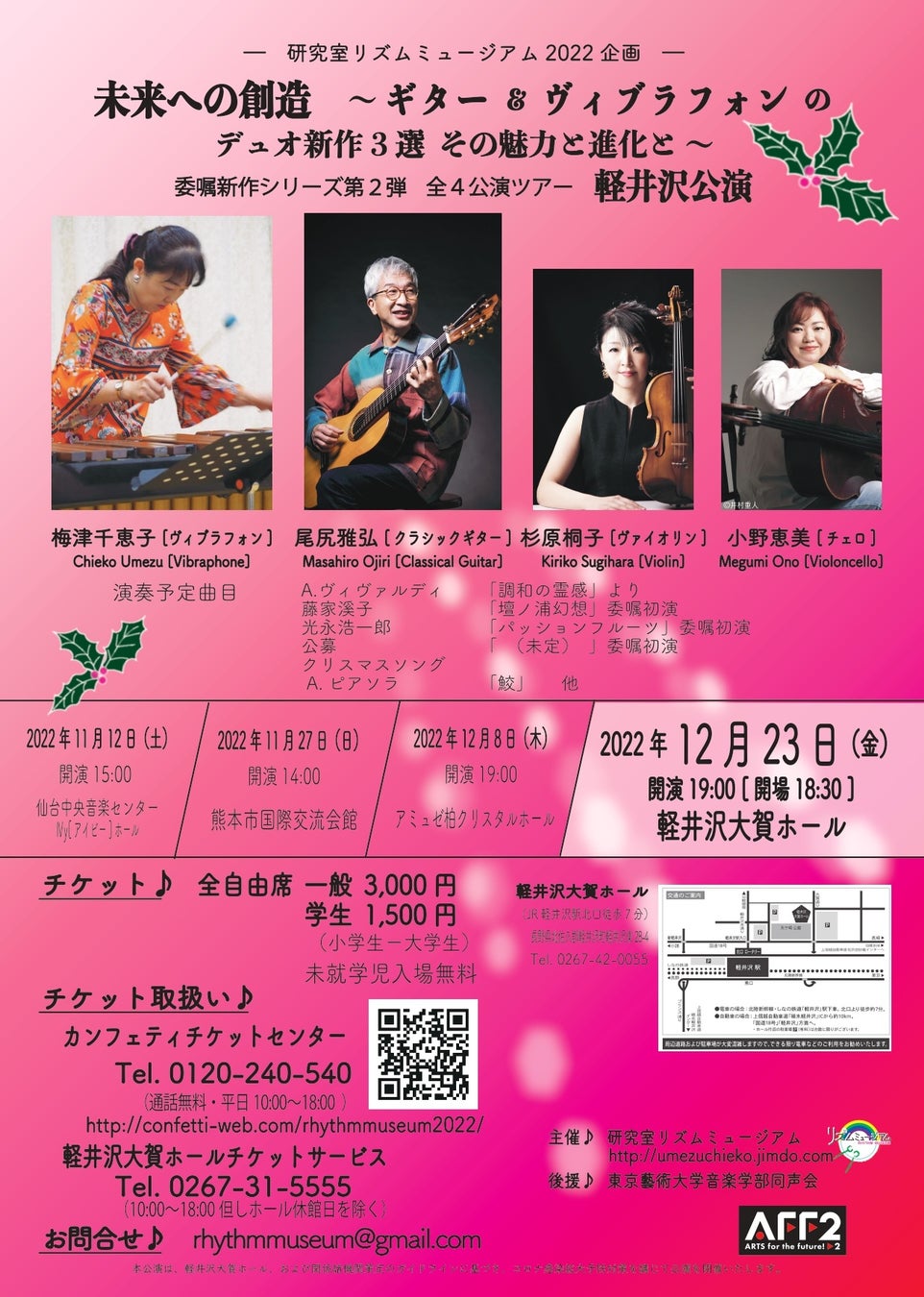 また、ヴィヴァルディからストラヴィンスキー、ピアソラまで、尾尻雅弘のギターと梅津千恵子のヴィブラフォンが織りなす豊潤なハーモニー!音楽の変遷とともに愉しいお喋りをすこしだけ♪