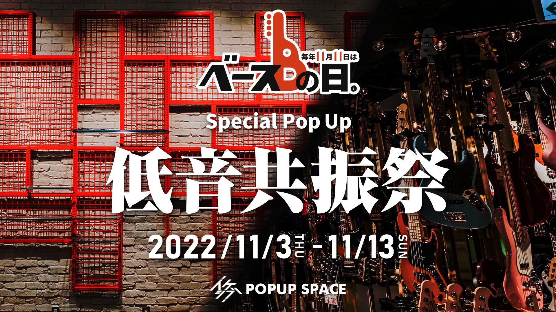 11月3日から11月11日「ベースの日」当日を挟み11月13日までの11日間、池部楽器店 旗艦店イケシブ(IKEBE SHIBUYA)1Fのイベントスペース「イケシブLIVES」にて、「ベースの日」を記念し、ベースセクションのみとしては初のスペシャルポップアップ「低音共振祭」を開催します。